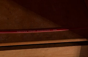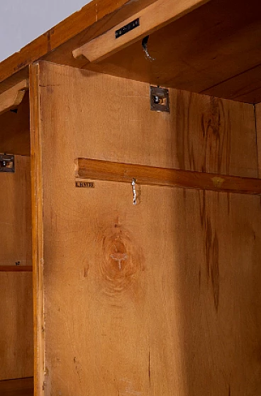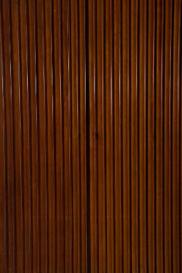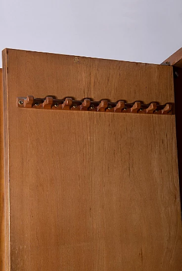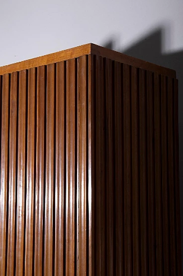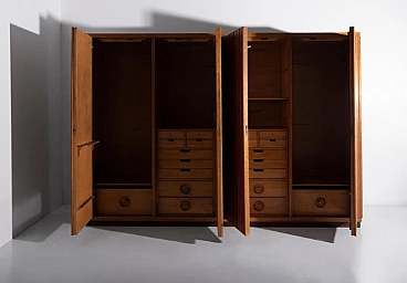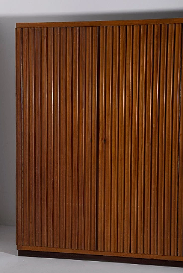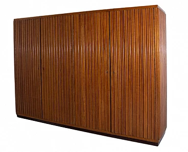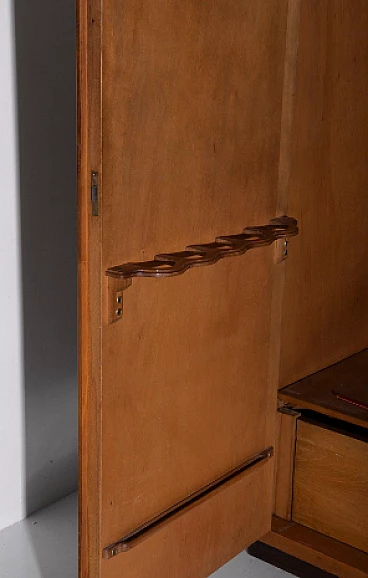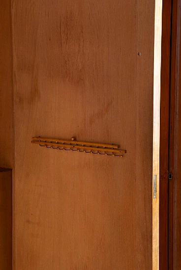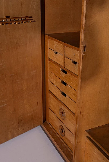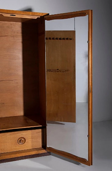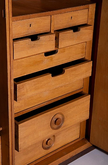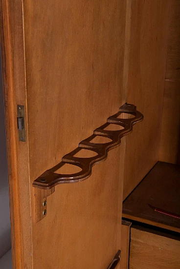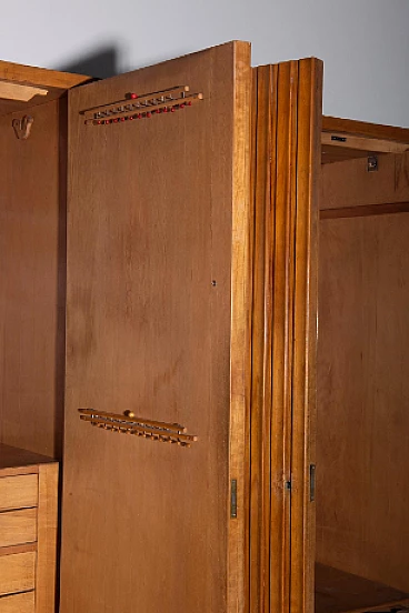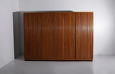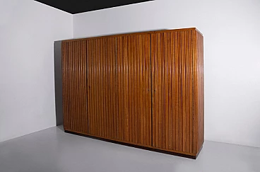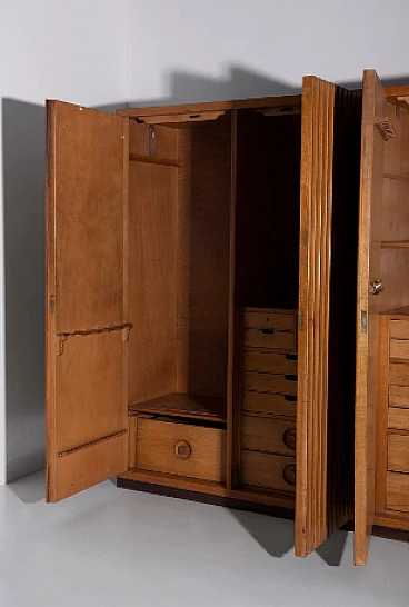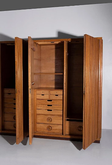 Armadio attribuito a Luigi Scremin per Industria Armadio Guardaroba Trieste, anni '50. È una testimonianza della dedizione dell'epoca alla qualità artigianale e all'eleganza senza tempo. La prima cosa che cattura lo sguardo è l'intricata lavorazione grissinata, una tecnica di lavorazione del legno a dir poco magistrale. Questi dettagli decorati adornano l'intera parte esterna del mobile, creando un incantevole arazzo artistico. Questi meticolosi dettagli ornamentali non solo aggiungono un tocco di opulenza ma unificano anche visivamente il pezzo, creando un esterno armonioso e squisito che mette in mostra l'abilità degli artigiani di quell'epoca. Il mobile è caratterizzato da quattro ante, ognuna delle quali nasconde un capolavoro dell'artigianato italiano del mobile. Le porte sono adornate con chiavi in ottone, a testimonianza dell'attenzione ai dettagli che definisce questo pezzo. L'apertura di queste ante rivela un mondo di artigianalità e funzionalità che è a dir poco mozzafiato. Partendo da destra, la prima anta presenta una sezione verticale per riporre abiti o pantaloni, accompagnata da un elegante cassetto il cui pomello in legno è meticolosamente intagliato; uno specchio a tutta altezza abbellisce l'interno di questa anta, aggiungendo funzionalità e un tocco glamour al pezzo. La seconda anta presenta diversi cassetti, sapientemente realizzati da abili artigiani, tutti in legno e posizionati sopra un comodo ripiano; questa combinazione di opzioni di stoccaggio evidenzia la versatilità e la praticità del mobile. La terza anta è uguale alla seconda ma senza lo specchio; i cassetti regnano sempre eleganti e robusti. L'ultima anta a sinistra offre un'altra sezione a tutta altezza per appendere gli abiti, garantendo ampio spazio per il tuo guardaroba. Ai lati del mobile, scoprirai aggiunte pensate come un portaombrelli, tutto meticolosamente realizzato in legno, e nella parte anteriore, un porta cinture e un porta cravatte; questi piccoli ma funzionali dettagli sottolineano il design accurato del mobile. Questo armadio è un capolavoro della qualità italiana ed è l'epitome di stile e raffinatezza. È l'aggiunta perfetta a una camera da letto elegante, aggiungendo un tocco di lusso ed eleganza senza tempo al tuo spazio abitativo. Condizioni originali dell'epoca, presenta segni di usura coerenti con l'età; non ci sono danni o rotture ma solo leggeri segni di usura e graffi.