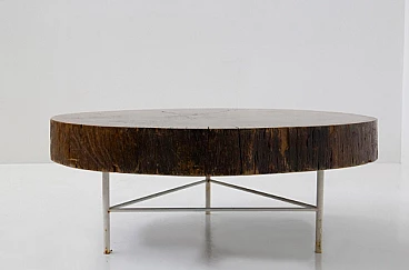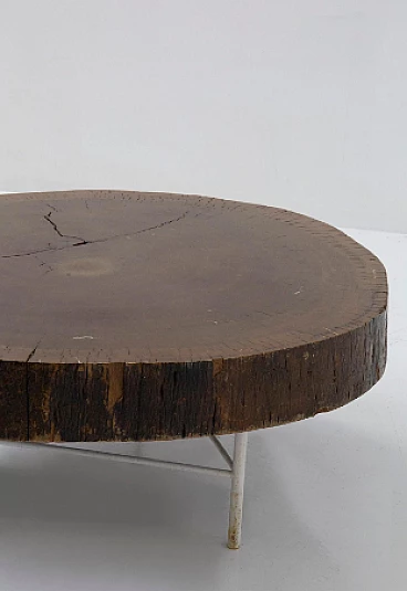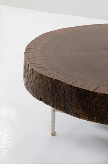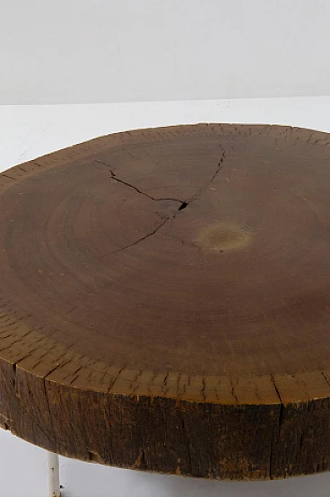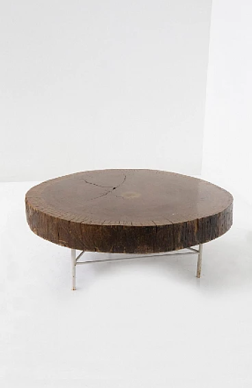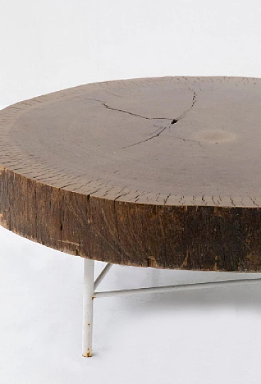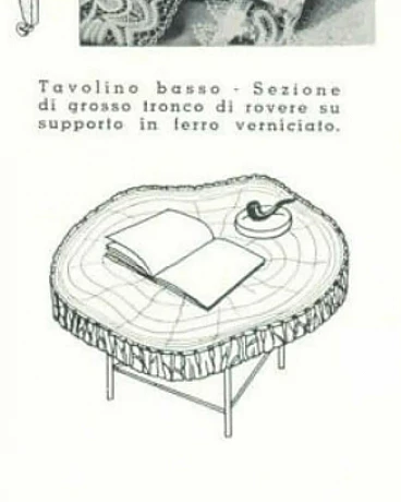Il tavolino Tronco, capolavoro concepito dal visionario Ignazio Gardella, è una creazione sorprendente che trascende i semplici mobili. Realizzato con una straordinaria passione per il design e un incrollabile rispetto per la natura, questo magnifico pezzo è più di un semplice tavolino, è una testimonianza dell'abilità dello spirito umano. Tronco è ricavato da una sezione colossale del tronco di quercia, conservando la storia e la bellezza dell'albero nelle sue stesse fibre. La sua superficie racconta una storia di crescita, forza e resilienza, con dettagli intricati e imperfezioni che parlano del passare del tempo. Tuttavia, il tavolino Tronco non si affida solo alla cruda eleganza del rovere, sposa la maestosità della natura con un tocco contemporaneo. Da sotto la superficie del rovere emerge un supporto in tubolare di ferro verniciato bianco, elegante e moderno. Questa giustapposizione di materiali crea uno straordinario contrasto visivo, dove il calore del legno incontra il fascino industriale del ferro. Pubblicato sulle pagine della rivista Domus, il tavolino Tronco si è guadagnato un posto alla ribalta. È un simbolo di innovazione ed eccellenza del design, un pezzo che cattura l'essenza di portare la vita all'aria aperta e un inizio di conversazione in ogni stanza. Guardando il tavolino Tronco non si può fare a meno di commuoversi per le emozioni che evoca. Ti invita a toccare la sua superficie strutturata, a tracciare gli anelli che sussurrano storie di generazioni passate. Ti invita a contemplare il connubio armonioso tra bellezza naturale e funzionalità moderna. Al cospetto del tavolino Tronco non si ammira semplicemente un mobile, si entra in contatto con un'opera d'arte che stimola l'animo e accende un profondo apprezzamento per il meraviglioso mondo del design. Buone condizioni, presenta graffi sul legno e sul metallo.