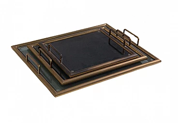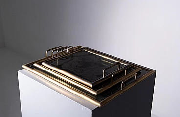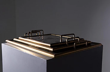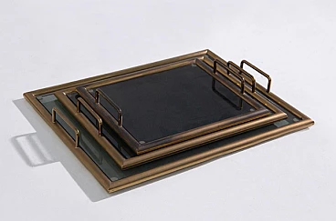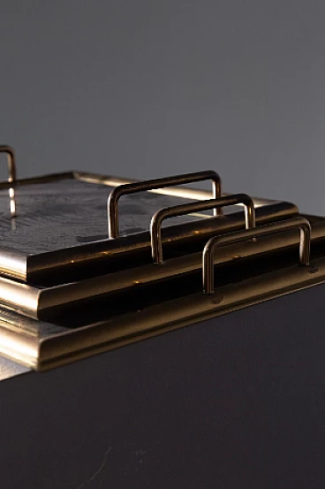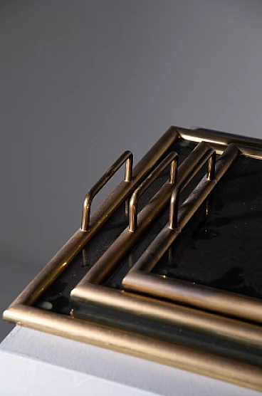 Set di tre vassoi in ottone e vetro fumé, anni '50. Trasudano eleganza e raffinatezza senza tempo. Realizzato con robuste strutture in ottone e sormontato da vetro fumé scuro trasparente, ogni vassoio incarna il lusso e la raffinatezza. L'inclusione di maniglie in ottone ne migliora la funzionalità e la trasportabilità, rendendoli un'aggiunta pratica ed elegante a qualsiasi tavolo da pranzo. Ideale per arredare e valorizzare i tavoli da pranzo con un tocco glamour, questo set di tre vassoi si integra facilmente con qualsiasi arredamento esistente. Che tu stia organizzando una cena formale o semplicemente cercando di migliorare la tua esperienza culinaria quotidiana, questi vassoi sono pezzi essenziali per aggiungere un tocco di fascino vintage e raffinatezza. Con il loro design classico e la squisita fattura, questi vassoi diventeranno sicuramente pezzi preziosi nella tua collezione di complementi per il set da pranzo. Il vassoio grande è alto 6 cm, largo 52,5 cm e profondo 42,5 cm. Quello medio è alto 6 cm, largo 42,5 cm e profondo 33,5 cm. Quello piccolo è alto 6 cm, largo 34 cm e profondo 30 cm. Buone condizioni originali; non hanno rotture, solo lievi graffi.