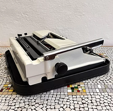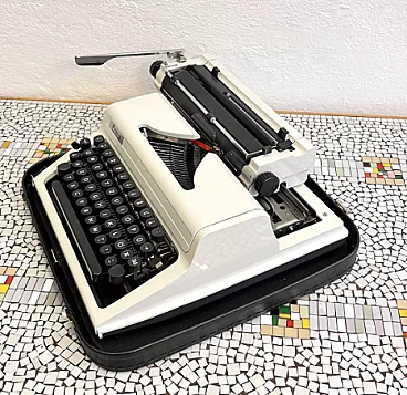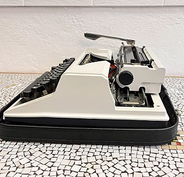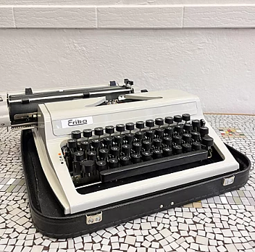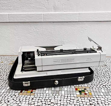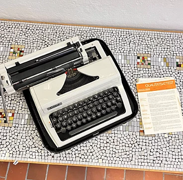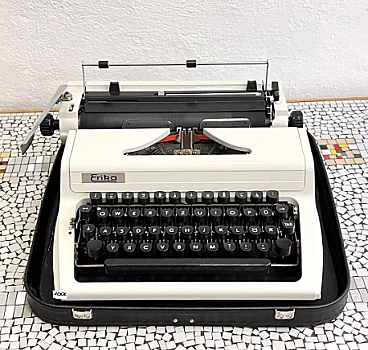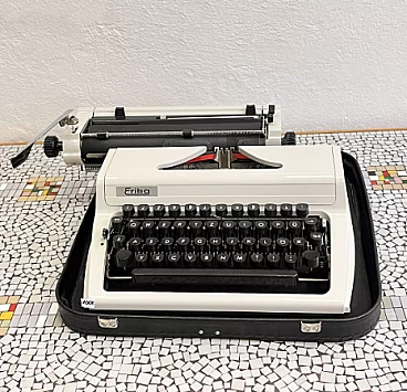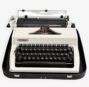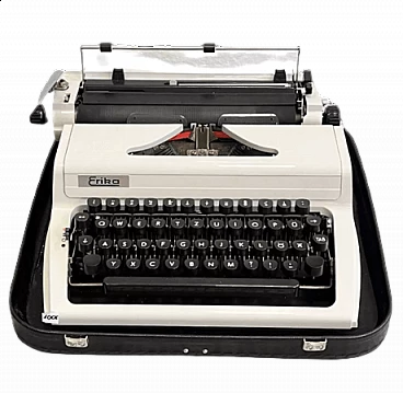 Macchina da scrivere con valigetta mod. Erika 105 di VEB Robotron Rechen-und-Schreibtechnik Dresden (Germania dell'Est), 1976. Erika è stata la base e l'ispirazione per la produzione di molte altre macchine come Optima, Prasident, Aztecs, CBM, Robotron, etc. Le macchine della serie 105, che sono la generazione successiva delle macchine Erika, sono un modello indiscusso di macchina da scrivere e sono considerate il canone del design industriale. La ditta Erika è una delle aziende produttrici di macchine da scrivere più importanti della storia e le macchine della serie 30/40 si trovano esposte in molti musei tecnici in tutto il mondo. L'esemplare è in ottime condizioni, probabilmente non è mai stato utilizzato o è stato utilizzato solo poche volte. Presenta lievi tracce d'uso. È funzionante, necessita solo della sostituzione del nastro, che si è già seccato a causa dell'età. La sola macchina da scrivere è alta 13 cm, larga 34 cm e profonda 34 cm. Con la valigetta è alta 15 cm, larga 39 cm e profonda 38 cm.