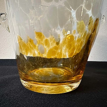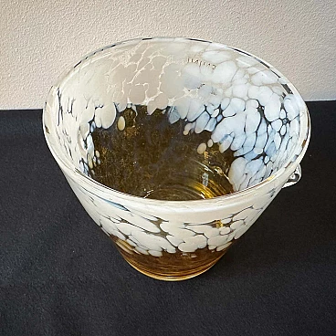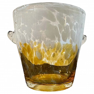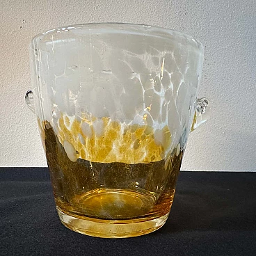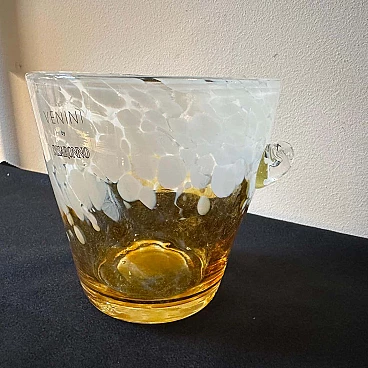Il design modernista del secchiello riflette le tendenze estetiche degli anni '80, caratterizzate da linee pulite, colori decisi e forme geometriche. Le vibranti tonalità gialle e bianche del vetro di Murano emanano un senso di vitalità e calore, aggiungendo un tocco di glamour a qualsiasi ambiente. Al di là del suo fascino estetico, il secchiello per il ghiaccio è anche altamente funzionale, in quanto serve come pratico accessorio per servire e raffreddare le bevande, in particolare l'Amaretto di Saronno. L'uso del vetro di Murano conferisce un senso di lusso ed esclusività al secchiello per il ghiaccio, elevando l'esperienza del bere per chi si concede il liquore. È in perfette condizioni.