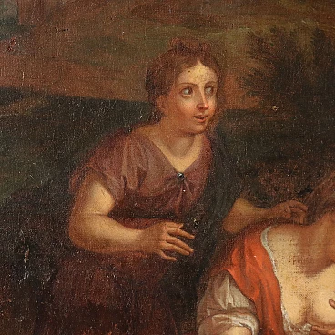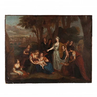 Si racconta l'episodio biblico narrato nel libro dell'Esodo in cui il piccolo Mosè, per sfuggire alla strage dei figli di Israele ordinata dal Faraone, viene lasciato dalla madre in una cesta sulle rive del Nilo, dove andava la figlia del Faraone a bagnarsi. Essa, trovatolo, decise di salvarlo e lo crebbe poi come un figlio alla sua corte. L'episodio è stato ampiamente utilizzato come soggetto pittorico, per la suggestione del tema: la scena ricca di personaggi vede al centro la principessa figlia del Faraone d'Egitto, circondata da tutto il suo seguito, che guarda e accoglie con il gesto della mano tesa il piccolo Mosè, che tolto dalla cesta alla sinistra, si protende affamato verso il seno della donna alle sue spalle, la balia pronta ad allattarlo. La scena è collocata in un paesaggio nordico e contemporaneo al dipinto, così come le figure vestono abiti del XVIII secolo, tranne la principessa che sfoggia un copricapo con diadema di gusto orientale.