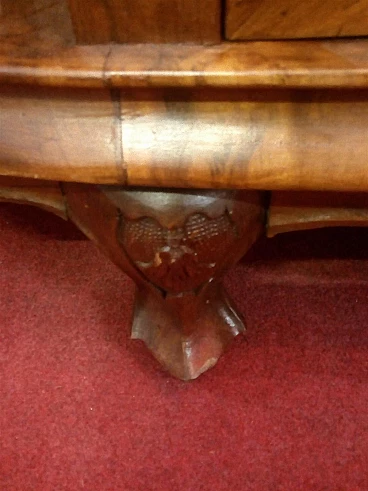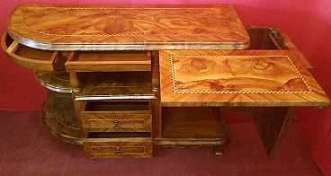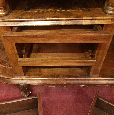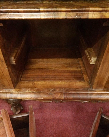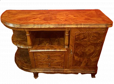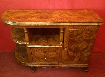 Credenza/mobiletto porta TV in radica di noce e noce realizzata artigianalmente in Veneto nella prima metà del '900. Dallo sportello di destra esce un piccolo piano d'appoggio che può fungere da scrittoio. Presenta numerosi scomparti segreti sotto il piano superiore e sotto i cassetti centrali. Le gambe sono intagliate e tipiche del '700 veneziano e