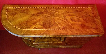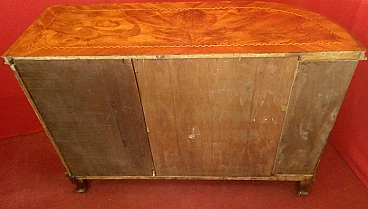 lungo tutto il mobile è presenta un intarsio geometrico in legni vari. Il mobile essendo poco profondo è ideale anche in un ingresso o un corridoio. Restaurato e lucidato a gommalacca.