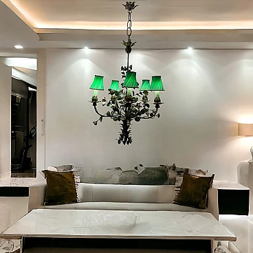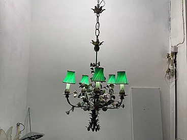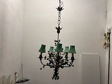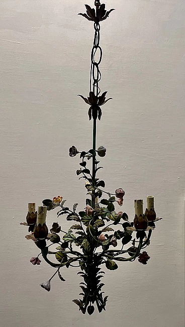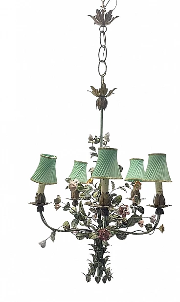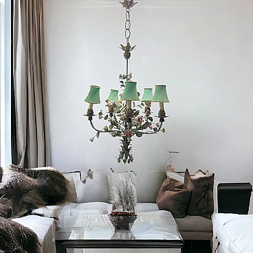 Antico lampadario a fiori in porcellana di Tole, anni '50. Prezzo - € 950,00 per articolo. Periodo di progettazione anni '50, paese di produzione Italia. Altezza comprensiva di catena e baldacchino a soffitto 100 cm, altezza senza catena 74 cm, larghezza 55 cm. Paralumi originali in seta verde chiaro. Cablaggio compatibile con Regno Unito, Europa e USA. Materiali - Faience (smaltata a stagno), ferro battuto. Peso leggero, inferiore a 40 kg. Condizioni buone, questo oggetto vintage/antico può presentare alcuni segni di usura come graffi e altri segni del tempo. Leggera usura coerente con l'età e l'uso, patina coerente con l'età e l'uso, componenti elettrici ricablati e/o nuovi. Questo pezzo è funzionante? Sì, ho fatto controllare il cablaggio da un elettricista professionista.