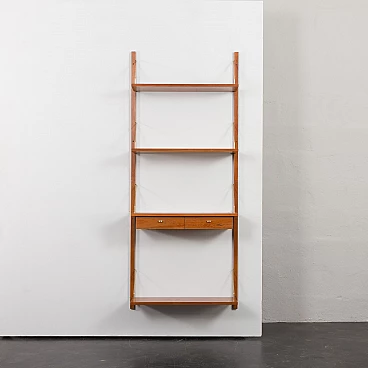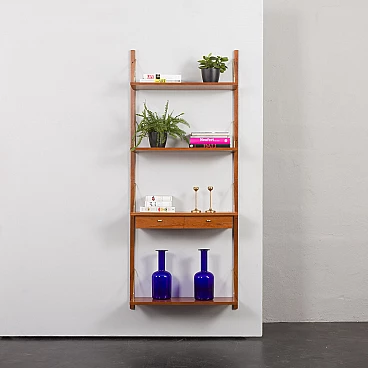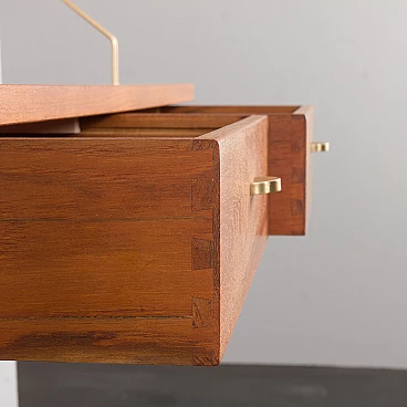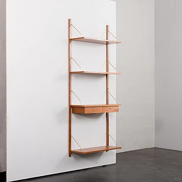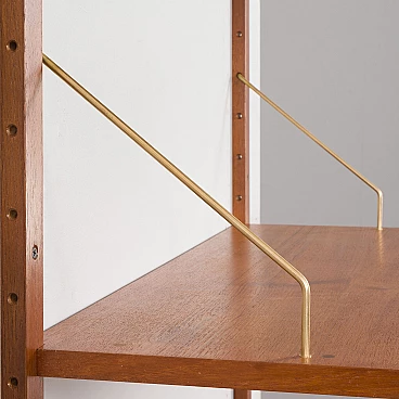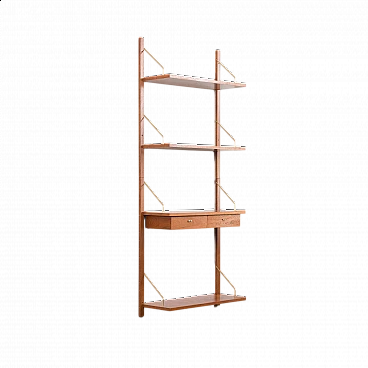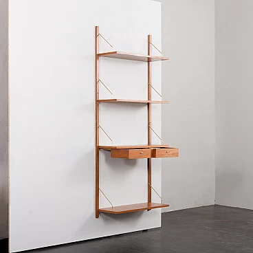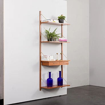 Libreria pensile danese con consolle nello stile di Poul Cadovius, anni '60. Si adatterà perfettamente all'ingresso, alla camera da letto o al soggiorno. La consolle con due cassetti e le maniglie in ottone abbinate alle staffe anch'esse in ottone rendono questo pezzo elegante e raffinato. Questo sistema di scaffalature è interamente modulare e può essere organizzato secondo necessità sfruttando i fori distanziati ogni 5 cm. I binari da 200 cm composti da due pezzi ciascuno offrono varie possibilità di disposizione. La consolle è alta 12 cm, larga 80 cm e profonda 30 cm; i cassetti sono alti 8 cm. Le tre mensole sono profonde 20 cm. È stata completamente rinnovata e la ferramenta in ottone è stata lucidata. L'unità è stata ricondizionata: sono state utilizzate parti vecchie e nuove per creare un aspetto coerente e armonioso con colori abbinati. Nel complesso, condizioni fantastiche con lievi tracce d'uso e ferramenta lucida. Il legno è stato preservato con uno strato di olio danese per esaltare la bellezza delle venature.