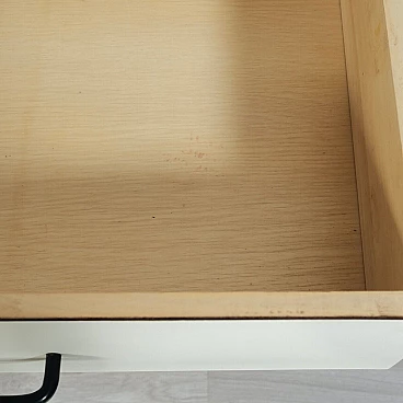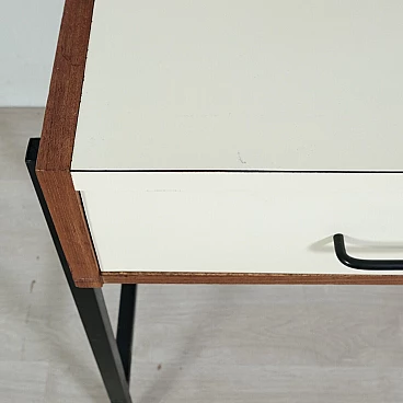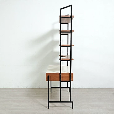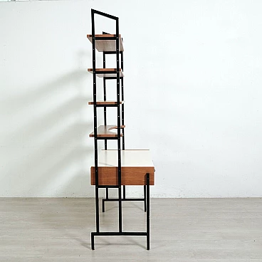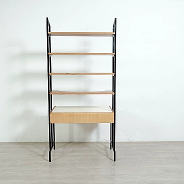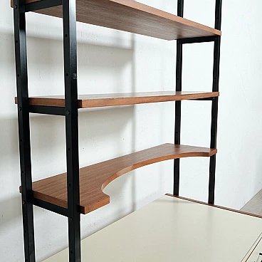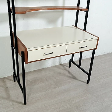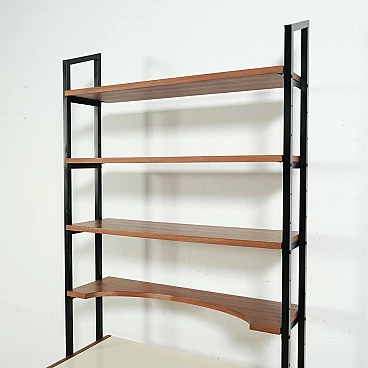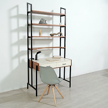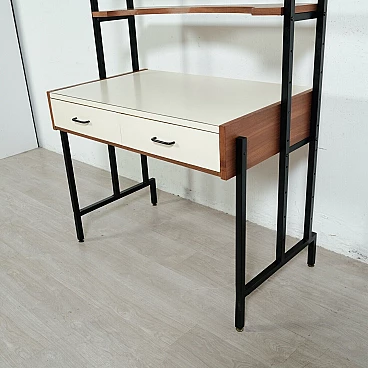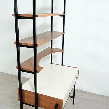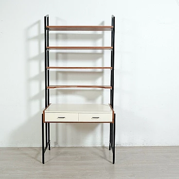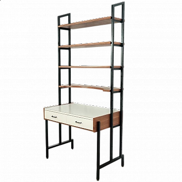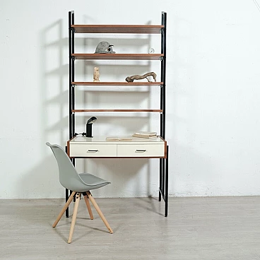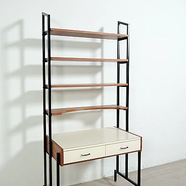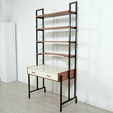 Libreria con scrittoio, anni '60 circa. Montanti laterali in ferro smaltato nero, mensole in legno impiallacciato e piano scrittoio con rivestimento superiore e frontale in formica color panna. Sono presenti quattro mensole regolabili e una quinta che è predisposta per essere posizionata sopra il piano scrittoio, poiché presenta una rientranza curva. Dotata di due comodi cassetti, ben scorrevoli, sotto il piano. Piedini in ottone, regolabili. Profondità del piano, che corrisponde alla profondità massima: 59 cm. Profondità delle mensole: 30,5 cm. Altezza da terra a sotto il piano (spazio seduta): 62,5 cm. Altezza al piano scrittoio: 79 cm. Buone condizioni con consueti segni d'usura (vedi foto).