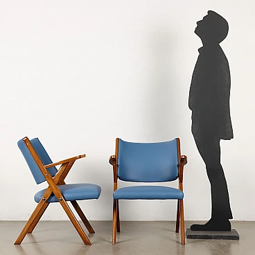 Coppia di Poltrone in legno di faggio tinto e skai azzurro, anni '50