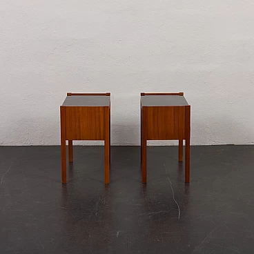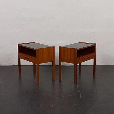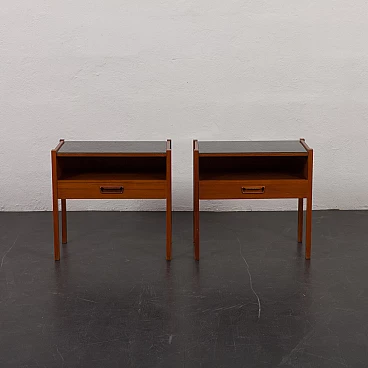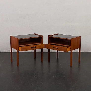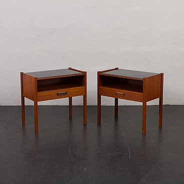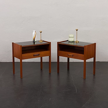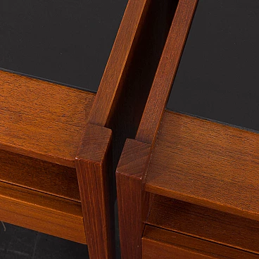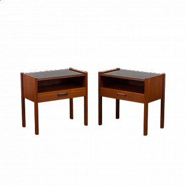 Coppia di comodini in teak con piano in vetro nero, anni '60. Progettati per portare stile e funzionalità in camera da letto o in soggiorno L'aggiunta di un piano in vetro aggiunge un tocco di raffinatezza garantendo durabilità e facilità di manutenzione. Questi comodini sono dotati di piani in vetro nero che poggiano liberamente sulla superficie del legno, consentendo una facile rimozione e un utilizzo opzionale. Dotati di un cassetto e di un vano a giorno di 32 cm, questi comodini sono pratici ed esteticamente accattivanti. Ogni comodino verrà spedito completamente assemblato, i piani in vetro saranno imballati separatamente per una maggiore protezione durante il trasporto. Tutto il legno è stato rifinito con prodotti professionali, i piani in vetro sono integri. Altezza dei cassetti: 6 cm.