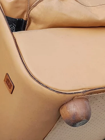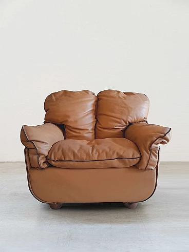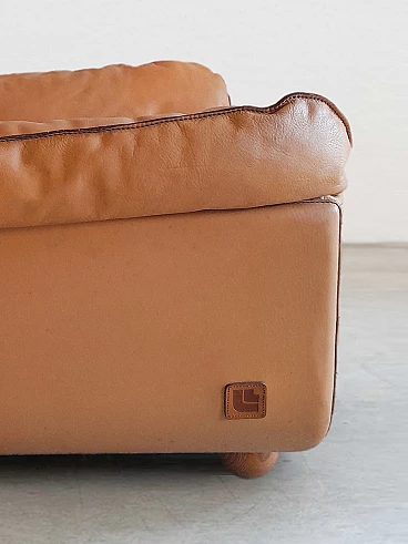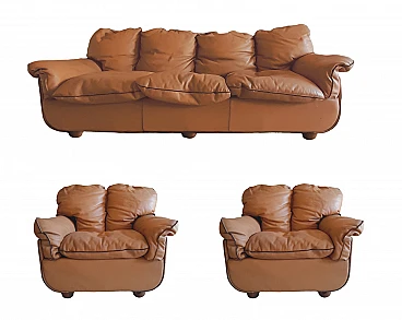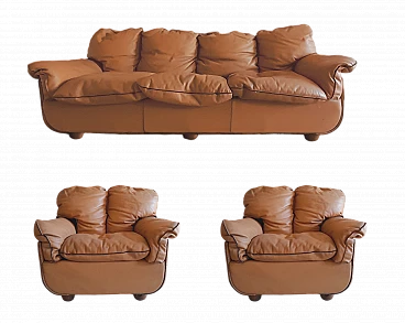 Divano e coppia di poltrone mod. Nido di Francesco Nale per Lev&Lev Milano, fine anni '70. Articolo molto raro per l'epoca e per il tipo di allestimento elevato, una versione da veri intenditori del design italiano. Il set è composto da tre pezzi (un divano e due poltrone), è stato realizzato 50 anni fa in Brianza dai migliori tappezzieri italiani e questa versione è molto rara perché rivestita non con la solita pelle ma bensì con cuoio naturale (a pieno fiore) e di forte spessore, con cuciture a vista che marcano l'effetto del taglio vivo del materiale. Una tipologia di manifattura ancora oggi molto moderna (ricorda molto la lavorazione della pelle e del cuoio del modello "Le Bambole" e della "CAB" di Mario Bellini). Imbottitura in vera piuma d'oca. In ottime condizioni, il set mostra solo pochi segni di usura come piccoli graffi o macchioline che conferiscono al colore naturale del cuoio un aspetto vissuto al punto giusto; questo perché è stato usato molto poco e soprattutto ben conservato, considerando i suoi 50 anni di vita. Il divano è alto 70 cm, largo 223 cm e profondo 86 cm. Le poltrone sono alte 70 cm, larghe 83 cm e profonde 86 cm.