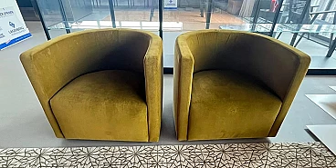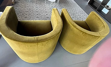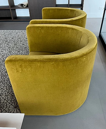 Coppia di raffinate poltrone Confidential in velluto giallo senape di Digione, design Piero Lissoni per Living Divani, 2011. Serie di poltrona imbottita con guscio circolare, dalle linee eleganti arrotondate. Volume monoscocca avvolgente, con rivestimento in morbido velluto color giallo senape di Digione L1172. Buonissimo stato di utilizzo, minimi segni. Utilizzate in sala di rappresentanza di corner aziendale e ambientazioni fieristiche di arredo. Prezzo nuovo della coppia con rivestimento in velluto 3800 euro. Larghezza 72 cm x profondità 66 cm x altezza 62 cm, altezza della seduta 37 cm.