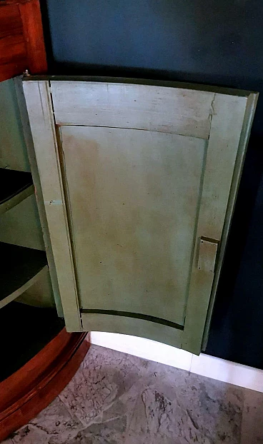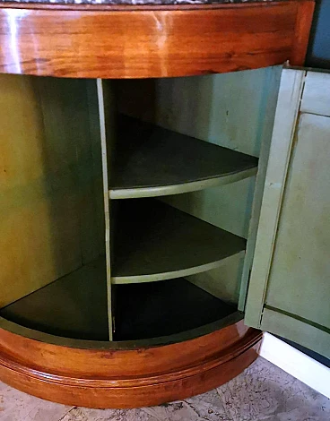 Eccezionale e rara angoliera Luigi Filippo francese in noce. Il corpo del mobile ha una linea sobria e molto elegante. Le due ante, dotate di serratura unica a chiave, sono massicce e curve. L'interno, tinteggiato in un gradevole colore verde, è stato diviso con un tramezzo verticale in due metà: quella di destra presenta due comodi piani orizzontali, in questo modo lo spazio è stato sfruttato in modo intelligente ed ottimale; l'anta sinistra in basso può essere fermata al divisorio centrale con un piccolo gancio. Il ripiano superiore dell'angolo è stato realizzato in marmo Nero Marquinia, un materiale lapideo di alta qualità a grana fine dal colore nero intenso, estratto dalla regione di Markina, Paesi Baschi, nel nord della Spagna; è uno dei più famosi e apprezzati pietre naturali nel mondo. Il marmo Marquinia è ampiamente utilizzato per lavori ornamentali pregiati. Il nostro progetto è ancora più particolare perché il marmo Marquinia ha molte più venature bianche del normale, un caso molto raro esteticamente gradevole e seducente. Il mobile è stato realizzato da veri Maestri Artigiani tra il 1870 e il 1875 in un laboratorio artigianale della cittadina di Pont-de-Beauvoisin, comune francese nel dipartimento dell'Isère, soprannominata "la città del mobile" per la sua antica tradizione della lavorazione del legno. Lo stile Luigi Filippo, sviluppatosi in Francia a metà dell'800, è caratterizzato da forme solide e decorazioni raffinate e mira ad esaltare la praticità e la funzionalità dei mobili. Le linee dei mobili sono dritte e sobrie e le forme sono ammorbidite con angoli arrotondati ed elementi arrotondati. I legni più comunemente usati sono quelli scuri, come il mogano, il noce e il palissandro. Per l'intera costruzione dell'angoliera è stata utilizzata un'eccezionale qualità di noce europeo, qualità esaltata anche da una lavorazione unica e speciale, "la lastronatura". Questa è una tecnica artigianale diffusasi in tutta Europa già a partire dal XVI secolo e rimasta immutata fino alla metà dell'800 prima della Rivoluzione Industriale, poi ripresa agli inizi del '900 per i mobili di lusso, soprattutto in Francia e Italia. Consisteva nel tagliare tronchi d'albero di legno nobile (noce, mogano, radica, piuma, etc.) in tanti strati di spessore variabile da 4 a 6 millimetri, che venivano poi applicati sui mobili a scopo decorativo. La finitura di questo processo è molto complessa: lo strato di legno viene trattato con terre naturali sciolte in acqua fino alla tonalità desiderata, viene antichizzato con pietra, fissato con gommalacca applicata a pennello e infine lucidato in 12 passate con un batuffolo di cotone imbevuto di gommalacca, olio di paglia con polvere di pietra pomice. La "lastronatura" non è da confondere con l'impiallacciatura, che è una lavorazione più recente; infatti lo strato di legno viene tagliato a macchina e lo spessore è inferiore a 1 mm., mentre quello di lastronatura, come già accennato, è da 4 a 6 mm. Questa tecnica ha permesso di esaltare i colori e la fiammatura del noce, donando ai nostri mobili un'eleganza e una raffinatezza unica ed esclusiva. L'angoliera è stata trattata a mano con antiche tecniche di restauro dal nostro team di artigiani ed è in ottime condizioni.