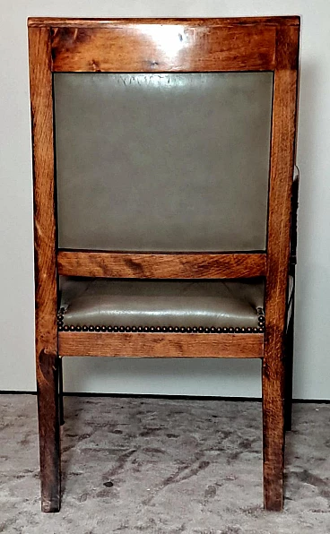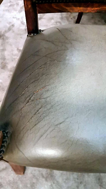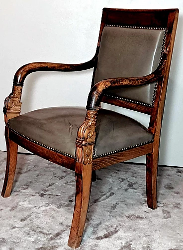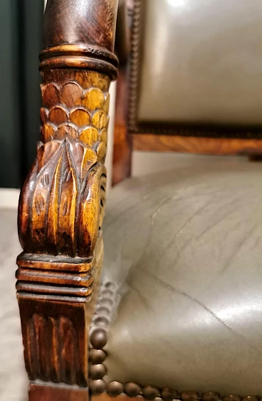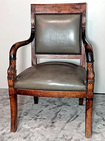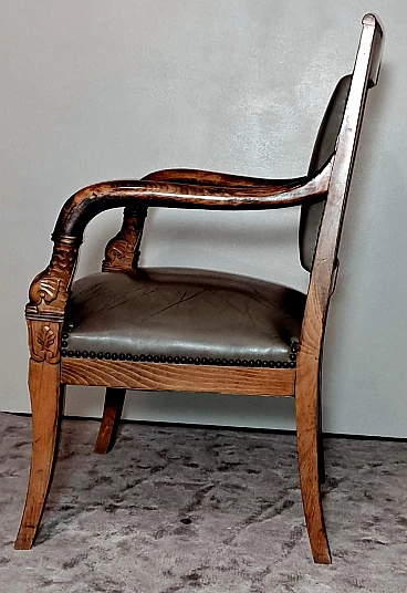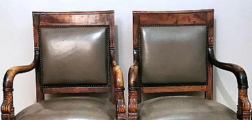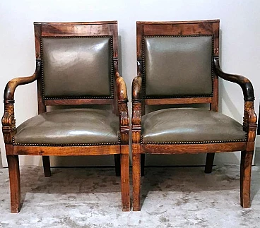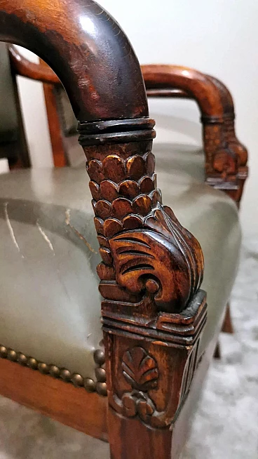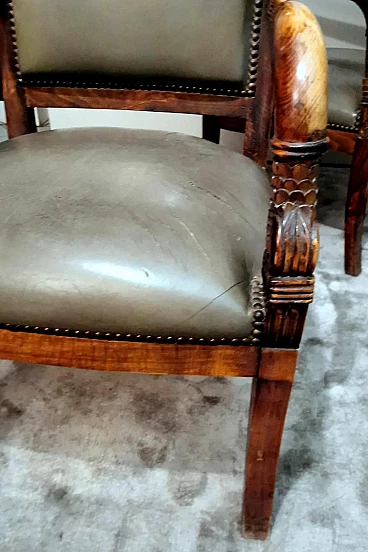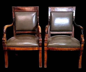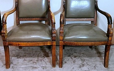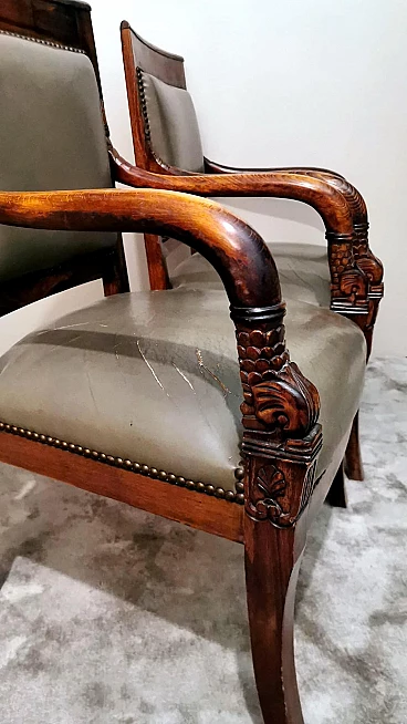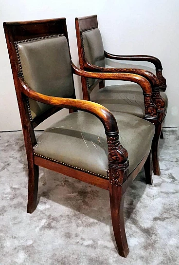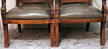 Affascinante e rara coppia di sedie "Antique Master" Carlo X con braccioli. Sono state realizzate in ottimo legno di rovere. L'imponente schienale è rettangolare e sul lato superiore è stata posta un'elegante finitura arrotondata; le gambe anteriori sono leggermente cabriole, mentre quelle posteriori sono la continuazione dello schienale. Sia l'ampia e comoda seduta che lo schienale sono imbottiti e rivestiti in vero cuoio in una raffinata tonalità verde. Straordinari e originali sono i braccioli, che hanno un raffinato andamento curvilineo a collo di cigno; partono dalla metà dello schienale e si raccordano con le gambe anteriori, schematicamente e iconicamente rappresentano due delfini superbamente scolpiti da un Maestro ebanista. Queste sono due caratteristiche distintive dello stile Carlo X, con cui furono realizzate le poltrone. Un'altra caratteristica affascinante è il colore che il legno ha assunto con il tempo, soprattutto i braccioli hanno un aspetto così caratteristico con la loro bella usura, che non abbiamo considerato di fare alcun restauro perché la patina superficiale velata delle poltrone e le loro piccole imperfezioni li rendono davvero seducenti e affascinanti e ne attestano l'antichità e l'autenticità. Dobbiamo fare chiarezza sul rivestimento delle sedie, abbiamo specificato che si tratta di "cuoio" e non "pelle", purtroppo in inglese esiste una sola traduzione delle due parole: "leather". In italiano con il termine "cuoio" si indica il cuoio molto rigido (suole di scarpe, selle di cavalli) o rigido (parte superiore delle scarpe) conciato esclusivamente al vegetale. Al contrario, il termine "pelle" si riferisce a tutti i tipi di pelle, sia conciata con metodi di concia al cromo, allume, vegetale o sintetica. Queste poltrone sono state create tra il 1830 e il 1835 in un laboratorio di ebanisteria nella cittadina francese di Liffon-le-Grand situata nel dipartimento dei Vosgi nella regione del Grand Est. Lo stile Restaurazione, nato dopo la caduta dell'Impero napoleonico (1814) viene spesso chiamato "Carlo X" perché fu sotto questo sovrano che assunse caratteristiche più marcate. Carlo X mirava a ripristinare il prestigio della monarchia e questo influenzò l'estetica del periodo. Lo stile Carlo X è noto per la sua raffinatezza ed eleganza. I mobili di questo periodo sono spesso caratterizzati da dettagli e lavorazioni intricati, che riflettono il desiderio di lusso e raffinatezza. Lo stile Carlo X rappresenta una fase di transizione nel design del mobile francese, combinando elementi del passato con una rinnovata enfasi sul lusso e sull'eleganza. È apprezzato per le sue linee aggraziate, la meticolosa lavorazione artigianale e l'integrazione di influenze storiche in un'estetica raffinata. Le poltrone "Antique Master" (o "King") sono generalmente più grandi del normale e venivano realizzate per membri di case reali, leader massonici, maestri di scuola, capi di consiglio e capi famiglia; chiunque possedesse e sedesse su una sedia "Master" assicurava una posizione di autorità sul gruppo. Le nostre sedie, con tutti i loro deliziosi dettagli d'epoca, trasudano un'eccezionale maestria e con la loro forma classica, si adattano facilmente a qualsiasi stile di arredamento. Le sedie sono in buone condizioni originali, il cuoio della seduta presenta leggere imperfezioni dovute al tempo come ampiamente documentato dalle foto. Altezza della seduta: 41 cm.
