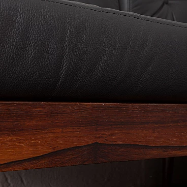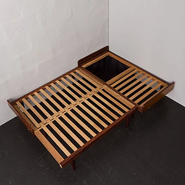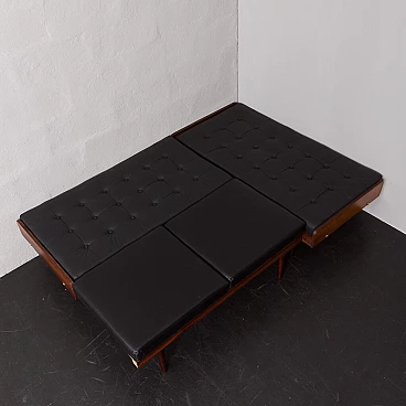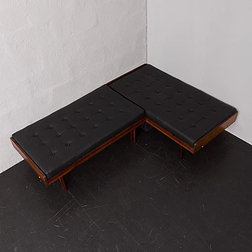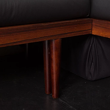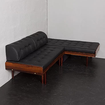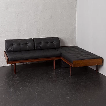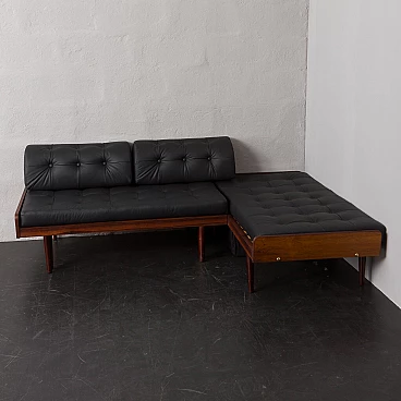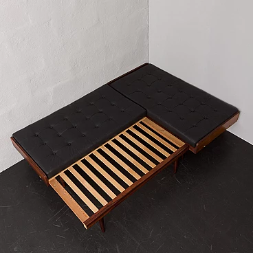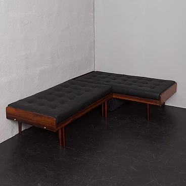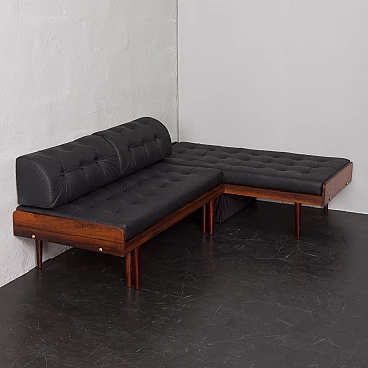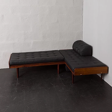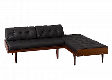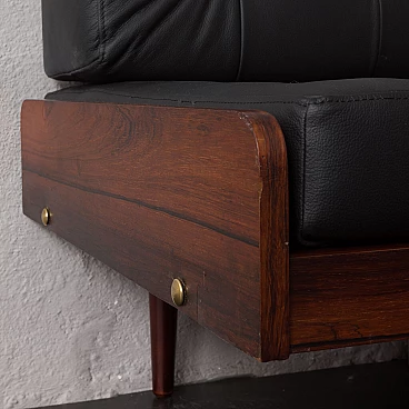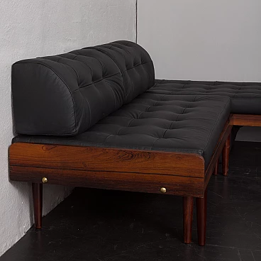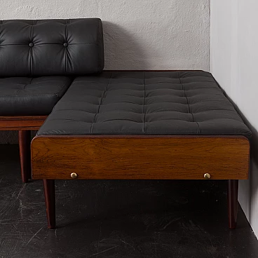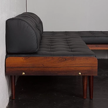 Minimalista ma elegante, questo divano letto/daybed angolare pieghevole in palissandro nello stile di Ejvind A. Johansson è stato realizzato in Danimarca negli anni '60. Realizzato splendidamente in palissandro dalle tonalità arancio-rossastre, aggiunge un tocco caldo a qualsiasi tipo di interno. I pannelli laterali, con i loro angoli delicatamente arrotondati, non solo mantengono i materassi in una posizione stabile ma evidenziano anche la ricchezza del legno. Il rivestimento trapuntato in pelle nera che riveste materassi e cuscini, si armonizza perfettamente con la struttura in legno, creando un design senza tempo. La costruzione ponderata del pezzo lo rende molto funzionale. Può fungere da divano angolare, divano letto per i sonnellini diurni o, grazie ai cuscini retrattili e al design pieghevole, trasformarsi in un letto a grandezza naturale per dormire. Sarà indispensabile quando la festa si prolunga e i tuoi ospiti vorranno restare un po' più a lungo, poiché il meccanismo di chiusura richiede solo pochi movimenti. Basta estrarre il giroletto e appoggiarvi sopra i cuscini riposti nel vano nascosto. Per le sue soluzioni costruttive e tecniche, come i perni in ottone e la costruzione di schienali in legno, riteniamo che sia stata progettata da Ejvind A. Johansson. I suoi progetti riflettevano l'etica danese di semplicità, artigianalità ed eleganza funzionale, tutti elementi senza dubbio visibili in questo pezzo. È in ottime condizioni vintage, con struttura stabile e meccanismi di chiusura perfettamente funzionanti. Il legno è stato rinfrescato con prodotti professionali. Originariamente i cuscini dello schienale erano due, ma su richiesta speciale possiamo fornirne uno aggiuntivo. Un materasso è alto 10 cm, largo 129 cm e profondo 72 cm. L'altro materasso è alto 10 cm, largo 140 cm e profondo 72 cm. I due cuscini dello schienale sono alti 25 cm, larghi 72 cm e profondi 28 cm ciascuno. I due cuscini aggiuntivi sono alti 10 cm, larghi 67 cm e profondi 62 cm ciascuno. Superficie per dormire: 200 x 140 cm.
