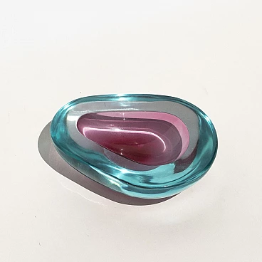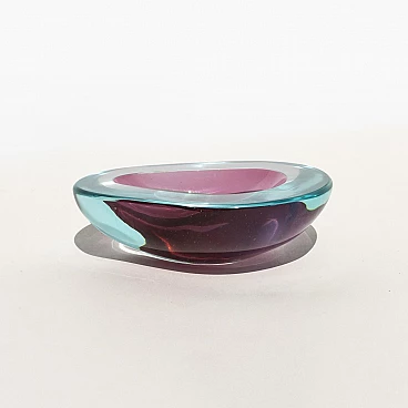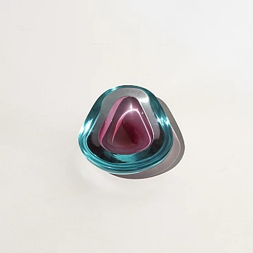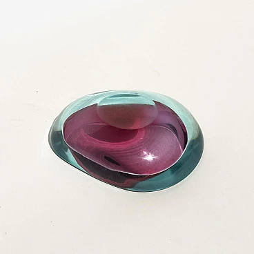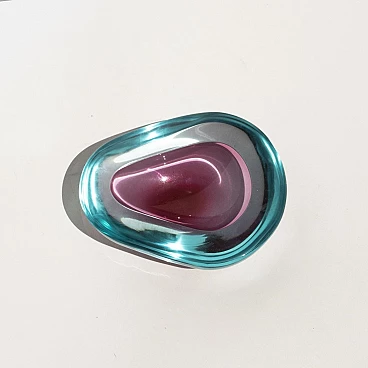 Ciotola in vetro di Murano sommerso nello stile di Flavio Poli, anni '60. Molti sono i diversi tipi di vetro creati dai maestri artigiani dell'isola veneziana di Murano: dai vasi sottili come l'aria alle sculture espressive, anche gli oggetti massicci con tonalità di colore profonde e vivaci rappresentano la grande abilità dei vetrai. La ciotola qui proposta, disegnata nello stile di Flavio Poli ma non attribuita direttamente a lui, è un perfetto esempio di quanto possa essere affascinante il vetro massiccio di Murano. Realizzata in vetro sommerso, nei toni del viola e dell'acquamarina, ha una forma a goccia e un fondo arrotondato. Può essere nata come posacenere o semplicemente come ciotola/elemento decorativo. Può essere datata approssimativamente alla metà degli anni '60, in base allo stile e ai colori. Non è firmata, come la maggior parte dei pezzi di quell'epoca, ma mostra una grande abilità artigianale ed è conservata in ottime condizioni. Non sono visibili crepe, ammaccature o danni di alcun tipo e solo una leggera patina rivela che si tratta di un oggetto di 50 anni fa.
