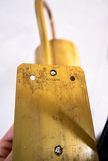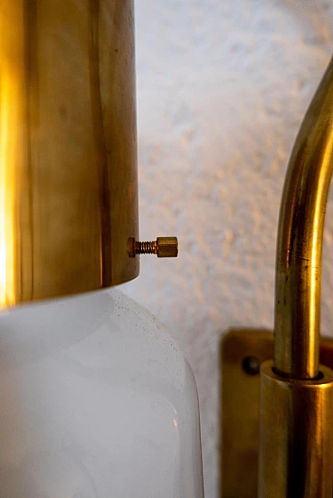 Applique LP10 Bidone di Luigi Caccia Dominioni per Azucena, anni '50. Caccia Dominioni è forse l'architetto più importante della Milano del secondo dopoguerra. I suoi progetti hanno avuto un grande impatto sulla ricostruzione della città devastata, aprendo al contempo la strada al nuovo stile che verrà definito da storici e critici "razionalismo milanese". Ma oltre a essere un architetto prolifico, autore di alcuni dei più celebri edifici residenziali della città, ha lavorato molto anche come designer, occupandosi di illuminazione e arredamento. Nel 1947, insieme ai colleghi Ignazio Gardella e Corrado Corradi Dell'Acqua, fonda Azucena. Il marchio, che prende il nome da un fiore, è stato attivo per molti anni nel campo del design di alto livello. Dopo uno stop di diversi anni, Azucena è stata riportata in vita e continua a produrre i pezzi per cui è diventata famosa in passato; tuttavia, sono i pezzi originali a far impazzire i collezionisti alle aste e sul mercato vintage. La qui proposta lampada LP10, soprannominata "Bidone" perché la sua forma ricorda il bidone del latte, fa effettivamente parte della prima produzione, come suggeriscono i dettagli e la patina. Il paralume in vetro è probabilmente originale e comunque corrisponde esattamente all'originale per forma, lunghezza e diametro. La lampada è perfettamente funzionante ed è stata recentemente ricablata da un elettricista professionista per garantirne la sicurezza durante l'uso.