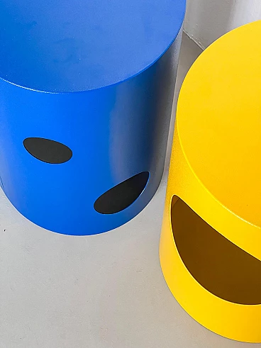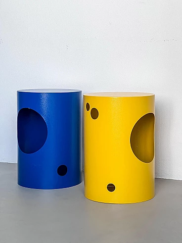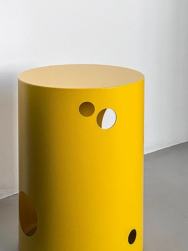 Tavolino/sgabello Silös in metallo giallo brillante. Perfetto sia come sgabello che come tavolino, deciso e ironico nel suo colore giallo brillante, il pezzo è rifinito con una vernice a "buccia d'arancia" molto resistente e materica. Silös è un omaggio al metallo, agli edifici industriali e agli spazi abbandonati. Ispirata al lavoro fotografico di Bernd e Hilla Becher, la collezione offre una visione contemporanea e raffinata della nitidezza dell'architettura utilitaria. I buchi vogliono simboleggiare la permeabilità al cambiamento e all'innovazione: un silos con i buchi non è pensato per immagazzinare ma per far uscire e condividere, questo è l'approccio che vogliamo promuovere, nel design e nella vita. I pezzi Silös rendono omaggio al paesaggio urbano di grattacieli e strutture industriali della "Città che sale" di Boccioni. Tutti i pezzi sono realizzati a Milano, per onorare l'ingegno artigianale della città.