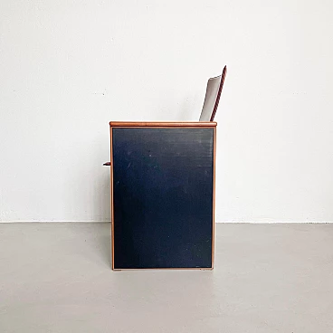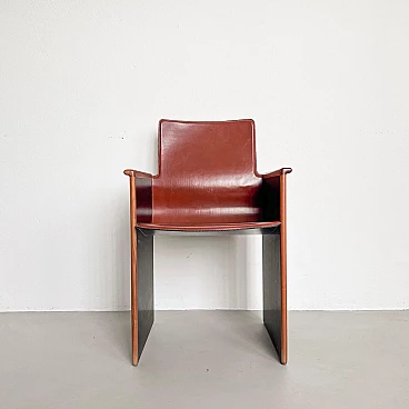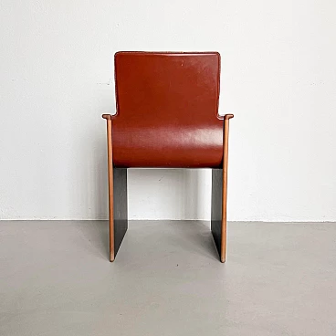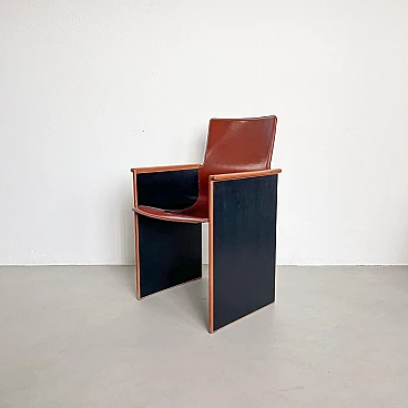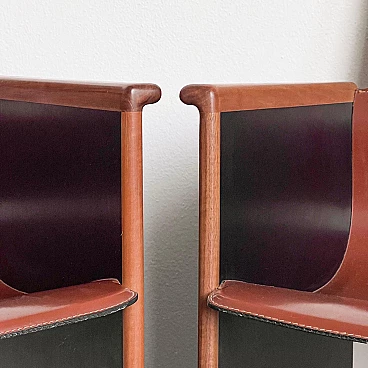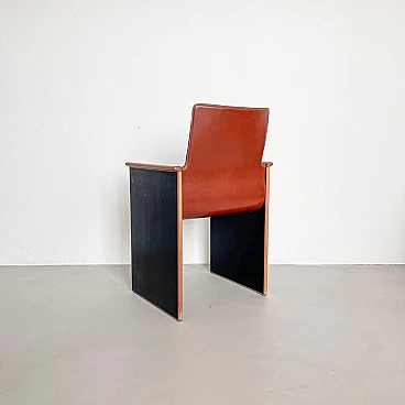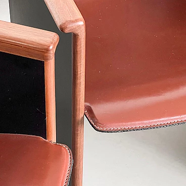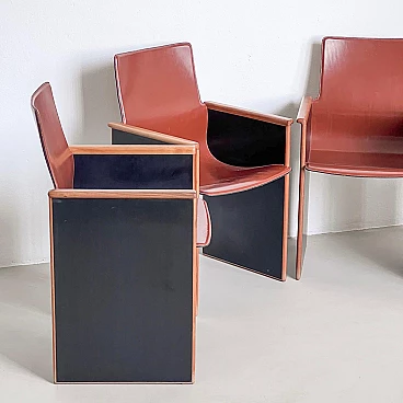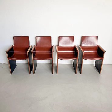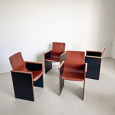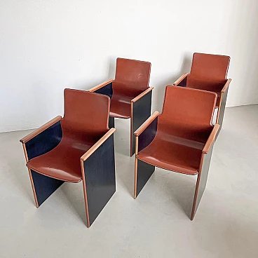 Rarissimo set di quattro poltroncine Segesta di Afra e Tobia Scarpa per Stildomus, anni '70 (disegnate nel 1976). Fanno parte della serie "Torcello", composta da sedie alte e basse, tavoli, librerie e armadi. Queste poltroncine, con gambe in noce italiano e sedili monoscocca interamente rivestiti in pregiata pelle tabacco, sono conservate in condizioni incontaminate. Le poltroncine Segesta sono già di per sé molto rare ma queste lo sono ancora di più a causa della finitura nera opaca delle gambe, in contrasto con l'impiallacciatura naturale comunemente utilizzata. Perfette per il tavolo da pranzo o per allestire uno spazio di conversazione, le poltroncine hanno un design senza tempo e sono molto comode. I segni dell'età sono minimi e tutte e quattro sono perfettamente bilanciate e con gambe regolari. Altezza della seduta: 42 cm.