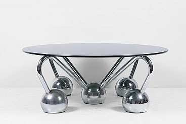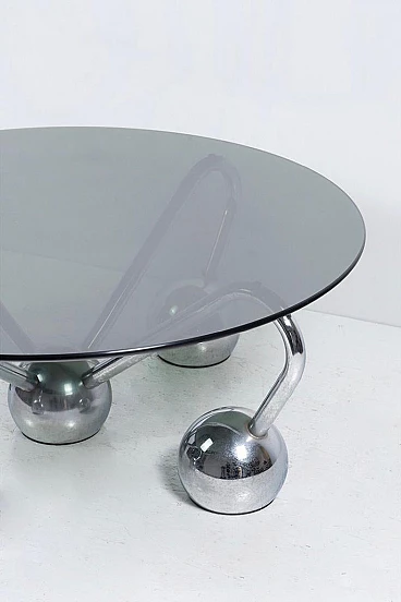 Tavolino Sputnik in metallo cromato e vetro fumé, anni '70