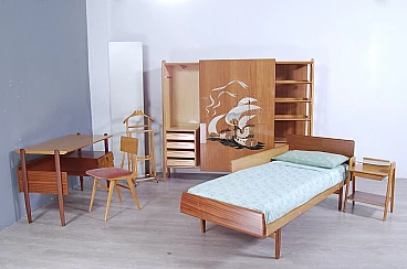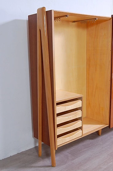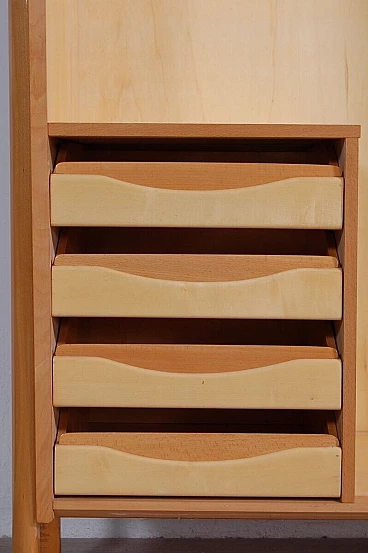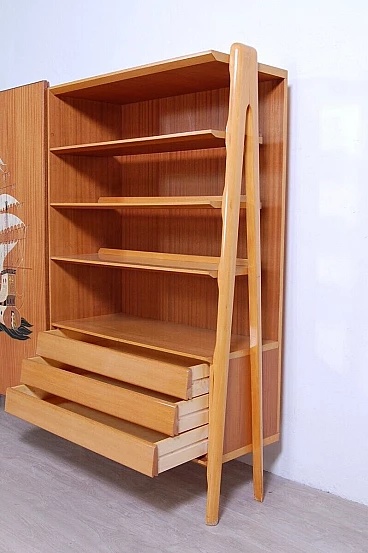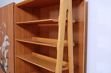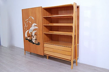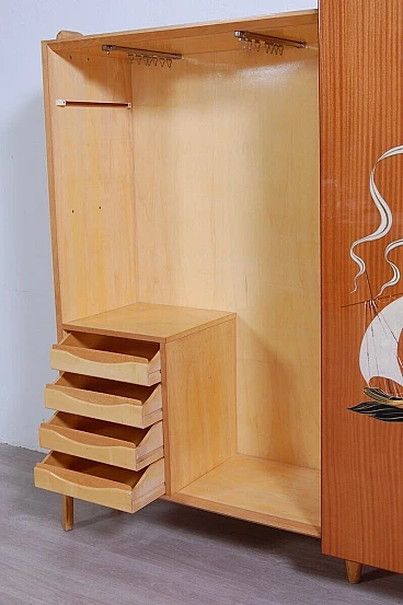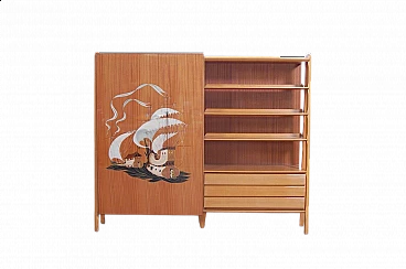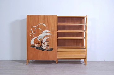 Mobile vintage con grande anta scorrevole e disegno realizzato a mano a tema caravelle. Interno diviso in due scomparti, a sinistra ci sono due colonne appendiabiti con sei ganci ognuno ed una piccola cassettiera con quattro cassetti. Perfetto come deposito giacche e accessori all'ingresso. A destra meravigliose mensole con tre cassetti in basso, le mensole non arrivano contro il fondo del mobile, hanno spazio libero sul retro (lo si vede bene nella foto laterale). Il design è davvero interessante e d'effetto. Per qualsiasi dubbio o domanda non esitate a scriverci. Larghezza 211 cm, profondità 47 cm, altezza 175 cm. Più che buone condizioni, lievissimi segni d’uso.