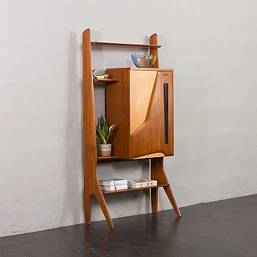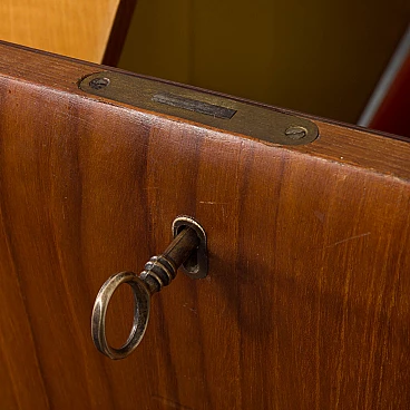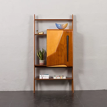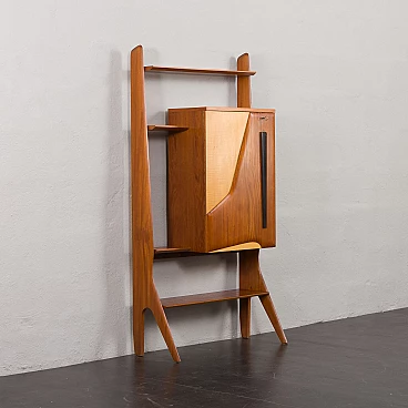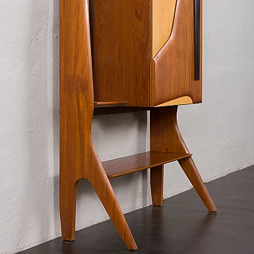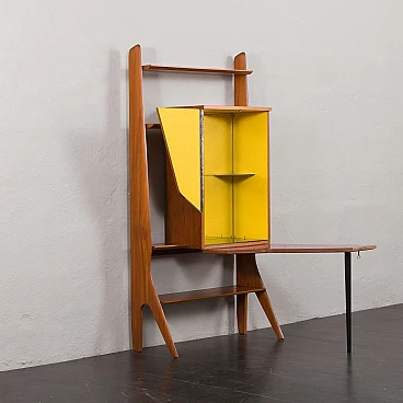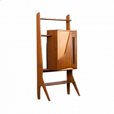 Mobile bar con piano estraibile attribuito a Ico Parisi, anni '50. Il suo design impareggiabile lo rende un'aggiunta accattivante e scultorea a qualsiasi interno. Parisi era noto per la sua raffinata maestria, le linee pulite e la sofisticata semplicità. I risultati dei suoi audaci esperimenti con materiali diversi, tra cui legno, metallo e vetro, sono visibili in questo pezzo sorprendente ma funzionale. A causa dei dettagli e della somiglianza a livello di falegnameria, crediamo che sia stato lui a progettare questo pezzo sofisticato. Il frontale del mobile bar, composto da due parti indipendenti decorate con impiallacciature di rovere e teak, crea un fantasioso puzzle geometrico. Grazie al funzionale supporto integrato nel frontale del mobile, una parte a ribalta si trasforma facilmente in un pratico piano d'appoggio per servire cocktail e bevande. L'eleganza dell'esterno, unita all'inaspettata ricchezza di colori e forme all'interno del mobile, dà l'impressione di aprire una scatola di cioccolatini. Il rivestimento in laminato rosso non solo protegge il legno dai danni ma lo rende anche facile da pulire. Il colore giallo brillante e il motivo geometrico del laminato all'interno del mobile, combinato con lo specchio e il vetro nero nella parte inferiore, mostrano lo spirito italiano della metà del secolo. Oltre al vano bar, il mobile offre ampio spazio espositivo per altri oggetti come libri e oggetti decorativi. I pannelli laterali in legno non solo forniscono stabilità ma, con le loro forme interessanti, geometriche e aerodinamiche, sono anche decorativi. Il mobile è stato controllato: è in condizioni vintage originali molto buoni, coerenti con la sua età e utilizzo; il meccanismo di apertura funziona senza intoppi. Gli interni sono stati puliti e il legno ringiovanito con prodotti professionali. Il ripiano superiore è largo 80 cm e profondo 16 cm. Il ripiano inferiore è largo 80 cm e profondo 24,5 cm. I due ripiani centrali sono larghi 25 cm e profondi 17,5 cm. Il vano bar è alto 79 cm, largo 55 cm e profondo 30,5 cm; quando completamente aperto è profondo 104 cm. Altezza al piano d'appoggio: 55,5 cm. Il ripiano interno in vetro è largo 51 cm e profondo 18 cm. I pannelli laterali sono alti 168 cm e profondi 37 cm.