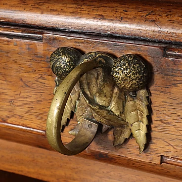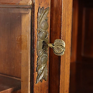In mogano, gli interni sono in rovere, è decorata con intarsi di gusto Liberty, maniglie, bocchette e inserti in bronzo lavorato con motivi fogliacei e a frutta. Alcuni dei vetri sono danneggiati.