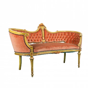 Divanetto due posti, riproduzione stile francese Luigi XVI di elevata qualità e manifattura, prodotto negli anni '70. Struttura solida in legno intagliato color oro e rivestimento in tessuto capitonnè color salmone. Buone condizioni, segni del tempo sul legno come da foto.