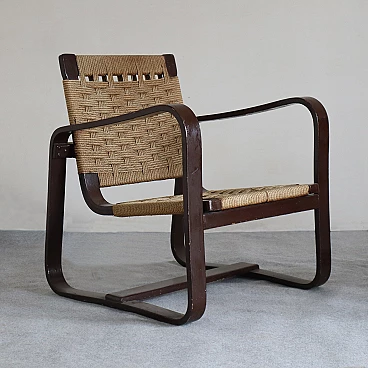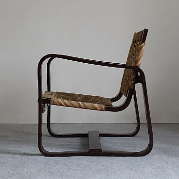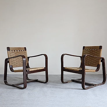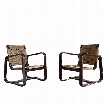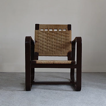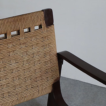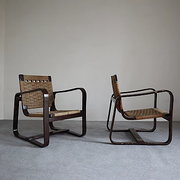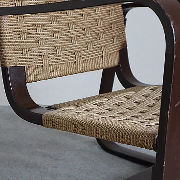 La seduta e lo schienale intrecciati con corda aggiungono un tocco di eleganza rustica e si fondono armoniosamente con le strutture in legno di betulla. Con dimensioni di Altezza: 76 cm, Larghezza: 61 cm, Profondità: 68 cm e Altezza della seduta: 35 cm, queste poltrone offrono comfort e stile senza tempo. La corda originale è mantenuta in buone condizioni, preservando l'autenticità e l'integrità delle poltrone. Aggiungi un elemento di prestigio e raffinatezza al tuo arredamento con queste poltrone 'Bocconi' di Giuseppe Pagano Pogatschnig, un'espressione straordinaria dell'arte del design italiano che continua a ispirare e affascinare anche oggi.