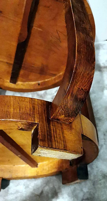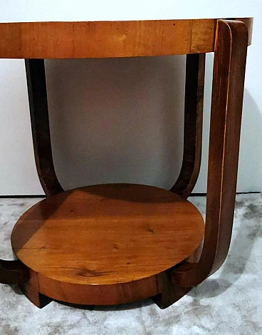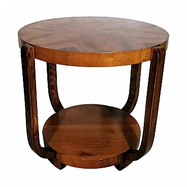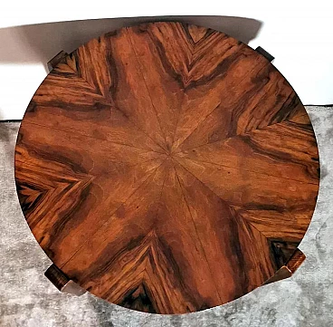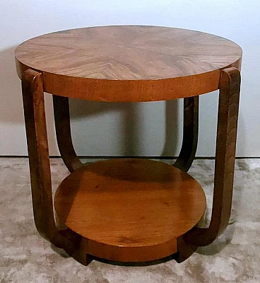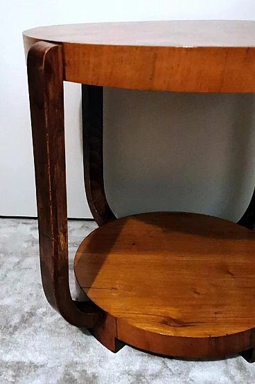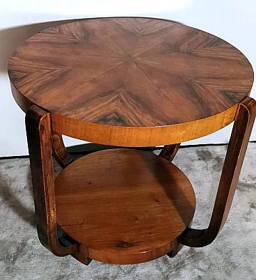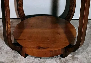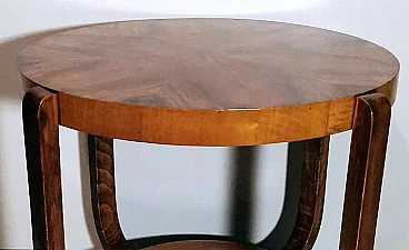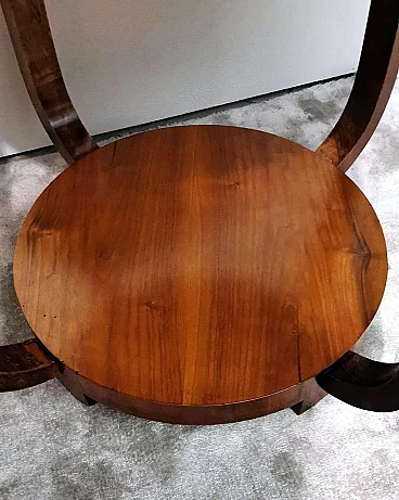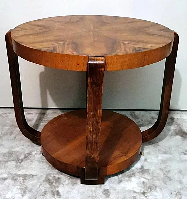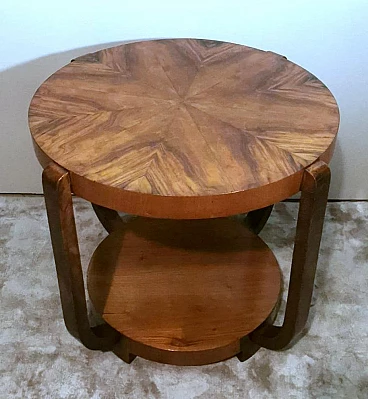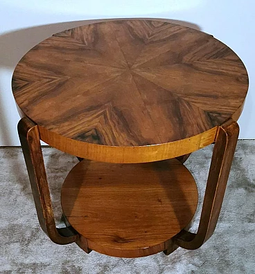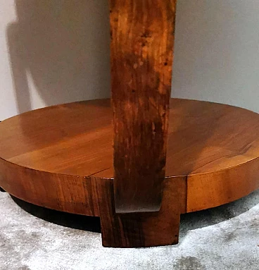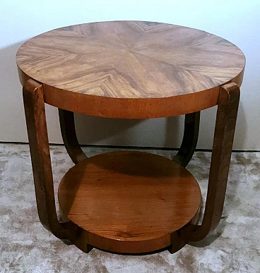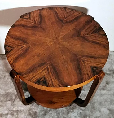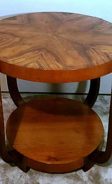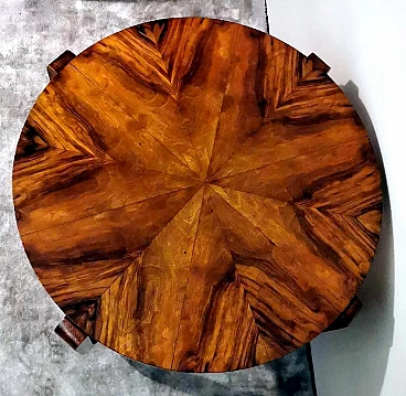 Raffinato ed elegante tavolino Art Déco italiano in noce, anni '30. Ha una forma immacolata e lineare, esteticamente ricercata e piacevole. Dal bordo del piano superiore rotondo si dipartono quattro solide gambe che nella parte inferiore si collegano in modo particolare e originale a un altro piano dando un'ottima stabilità all'insieme. Il tavolino è stato realizzato, tra il 1930 e il 1935, in un laboratorio artigianale di Cantù, una città situata nella provincia di Como in Lombardia, rinomata nel tempo per la sua tradizione nella produzione di mobili di lusso e da sempre considerata un importante centro per l'artigianato del mobile con una reputazione consolidata negli anni nella creazione di pezzi di alta qualità. Le aziende di Cantù hanno sempre fornito mobili per una clientela di alto livello, che comprendeva sia privati che progetti di arredamento di lusso per hotel, ristoranti e residenze prestigiose in tutto il mondo. Questo tavolino, con dimensioni intelligentemente contenute e linee forti e semplici, ha un'eleganza senza tempo e il suo design gioca tra austerità e rigore, mentre la sua linearità esagerata conferisce all'oggetto un carattere dinamico e maestoso. L'elemento distintivo e unico del tavolino è il legno con cui è impiallacciato, lo "Juglans regia", chiamato "noce nazionale" o "noce europeo". Il noce (Juglans regia) è un legno duro pregiato e costoso; i suoi colori, la sua fiammatura e le sue venature sono state apprezzate per secoli. Si tratta di un legno dall'aspetto estetico impareggiabile. I mobili in noce sono molto ricercati ma anche costosi perché la parte di legno utilizzabile in ogni pianta è molto scarsa. L'impiallacciatura è un'antica tecnica di lavorazione del legno che prevede l'applicazione di uno strato sottile di legno pregiato su un substrato di legno di noce di qualità normale. Il legno di noce pregiato viene raccolto da alberi cresciuti appositamente per questo scopo, quindi viene tagliato in fogli sottili il cui spessore varia da 1 a 2 millimetri. Il legno di base viene preparato applicando una colla speciale, quindi i fogli di noce pregiato vengono applicati manualmente e in modo uniforme; dopo questa lavorazione il tutto viene pressato e lasciato asciugare, permettendo alla colla di aderire saldamente tra il legno di noce pregiato e il substrato, creando un'impiallacciatura stabile. Questa, una volta asciutta, viene rifinita con la levigatura, la lucidatura e l'applicazione di finiture protettive, come vernici o oli, per migliorare l'aspetto e la durata del legno. La storia dell'impiallacciatura risale a molti secoli fa: si ritiene che sia stata utilizzata per la prima volta nell'antico Egitto e in Cina. Nel corso dei secoli, questa tecnica si è diffusa in tutto il mondo e ha continuato a evolversi, diventando una parte importante della produzione di mobili, articoli di lusso e objet d'art di alta qualità. Questa antica tecnica, applicata al tavolino qui proposto, ha permesso di esaltare i colori, la fiammatura e le venature del noce pregiato. Il nostro team di artigiani ha completamente restaurato a mano l'intera struttura in legno e il mobile è in ottime condizioni.