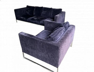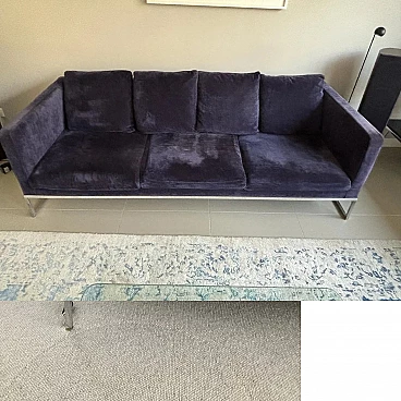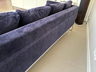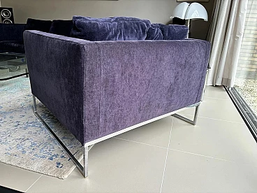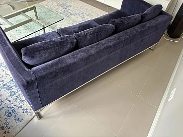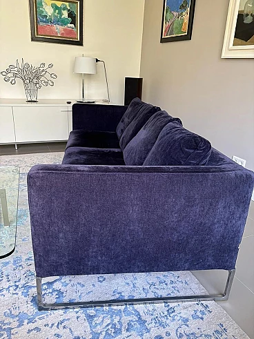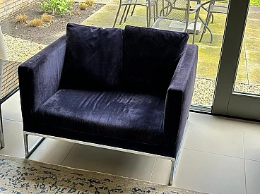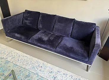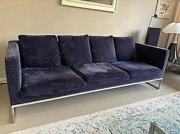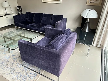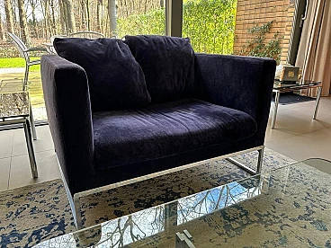 Elegante area salotto Tight composta da divano e poltrona in velluto Maxalto blu di Antonio Citterio per B&B Italia. Divano 210L a tre posti e poltrona 100 XL di B&B Italia disegnati da Antonio Citterio. In buonissime condizioni generali e d'uso. Tappezzeria senza danni e nessuna parte mancante. I cuscini morbidi e belli compatti. Minimi segni di utilizzo, in prevalenza sui cuscini di seduta. Qualche piccolissimo segnettino sulle gambe per l’uso del Daison. Per il resto il set è ok. Rivestimento in morbido e vellutato tessuto Maxalto in velluto blu. Top di gamma. Base strutturale portante e ed elementi di appoggio delle gambe a slitta, realizzata in profilati di acciaio inox. Cuscini imbottiti in piuma belga Fill Piuma. I rivestimenti sono sfoderabili. Naturalmente, qua e là sono visibili segni d'uso per una composizione che ha più di 15 anni. Ma è comunque un bellissimo set da salotto. Poltrona acquistata a 2850 e il divano acquistato a 8550 euro, per un totale di 11400 euro. Dimensioni divano: larghezza 210 cm, profondità 88 cm, altezza 67 cm, altezza seduta 38 cm, profondità di seduta 65 cm. Dimensioni della poltrona: larghezza 100 cm, profondità 88 cm, altezza 67 cm, altezza seduta 38 cm, profondità seduta 65 cm.