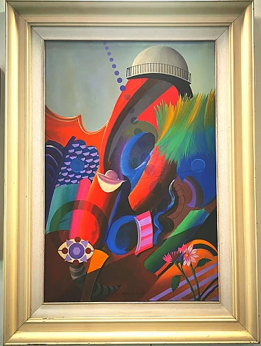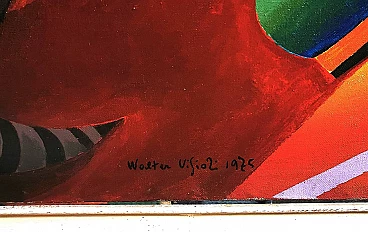 Dipinto a olio su tela "Mondo Fantastico" di Walter Visioli (Casalmaggiore, 1919 - Sondrio, 2009), 1975. Misure senza cornice: 90 x 60 cm. Visioli ha raggiunto agli inizi degli anni '60 la Contea di Bormio facendola diventare qualcosa di più della sua nuova patria. La cantava con le sue poesie proposte quasi come un cerimoniale nelle situazioni e occasioni più diverse. Lo ha fatto sino all'ultimo, descrivendo quanto di bello aveva scoperto in questa vallata al punto da inventare, forse anche per renderle omaggio, uno dei più prestigiosi premi di pittura estemporanea, il Premio Contea di Bormio. Un concorso che ha segnato la storia artistica del Bormiese e che è stato accompagnato dalle vicende anche personali e umane del suo patrono, lo stesso Visioli. Un personaggio d'altri tempi, una vita vissuta intensamente e raccontata in quelle pagine di diario che sono i volumi da lui pubblicati in cui ci svela incontri particolari, retroscena piccanti, vip e gente comune. Lui, però, non era uno comune: "Quando non si può avere quello che si ama… Bisogna amare quello che si ha!" aveva scritto a mo' di dedica su uno dei suoi libri. Visioli ha amato tanto la sua terra diventandone una sorta di istrione e di cantore, attraverso quadri e fumetti, poesie e pagine di diario.