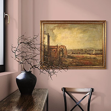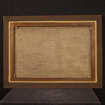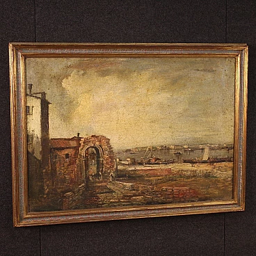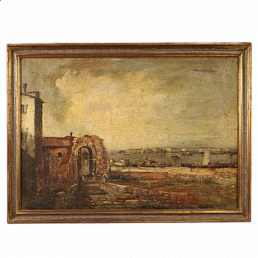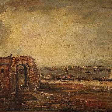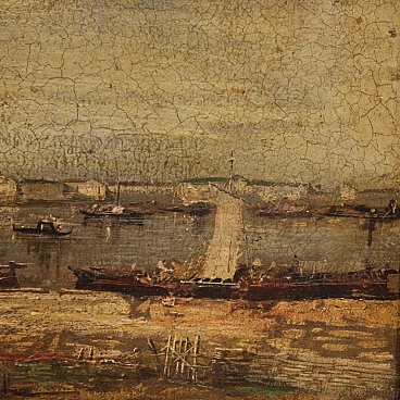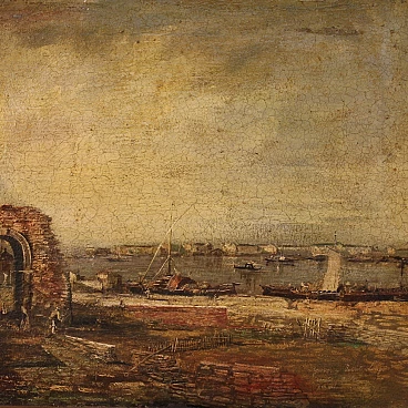 Paesaggio marino con pescatori e barche, olio su tela