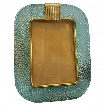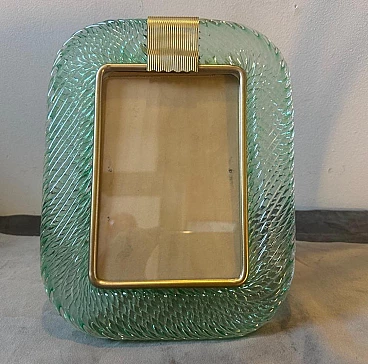Una cornice in vetro di Murano verde chiaro disegnata e prodotta a Venezia nello stile di Barovier, in condizioni incantevoli. La cornice vintage è un pezzo d'arredamento bello ed elegante, perfetto per esporre i tuoi ricordi preferiti con stile. Barovier è una rinomata azienda vetraria italiana attiva dal 1295 e i suoi prodotti sono molto apprezzati dai collezionisti e dagli appassionati di design. Il portafoto ha una forma rettangolare con una cornice interna pulita in ottone massiccio. La parte esterna della cornice è realizzata in vetro verde trasparente di Murano. Il vetro è stato lavorato con cura da abili artigiani e ogni pezzo è unico grazie alla natura del processo di lavorazione del vetro. Questo portafoto è un perfetto esempio dello stile Art Deco, popolare all'inizio del XX secolo, caratterizzato da forme geometriche audaci, linee eleganti e un'attenzione particolare al lusso e all'artigianato. Il portafoto è un pezzo senza tempo che aggiungerà eleganza e raffinatezza a qualsiasi stanza.