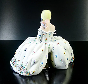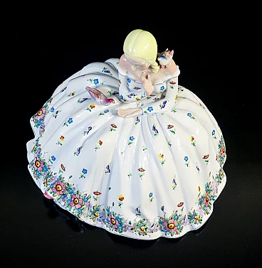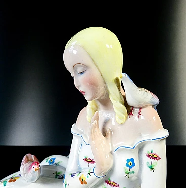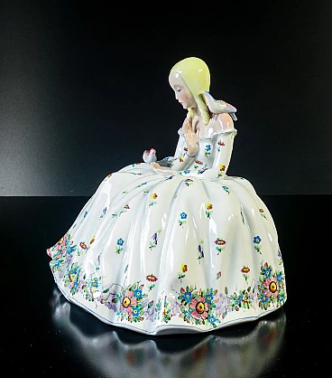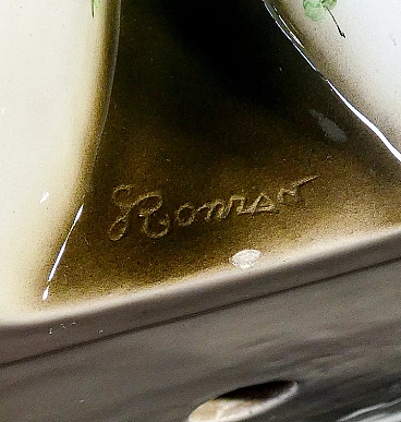 Scultura in ceramica dipinta a mano di Antonio Ronzan raffigurante una ragazza con degli uccellini, anni '40. È in ottime condizioni, come è facile constatare dalle foto allegate. Riporta alcune minuscole mancanze superficiali nello smalto, di scarsa importanza. Il ceramista Antonio Ronzan nasce a Nove di Bassano il 4 luglio 1914. Lavora per la manifattura ceramica torinese Lenci, insieme ai fratelli Giuseppe, Giovanni e alla sorella Tina dal 1937 fino al 1939. Dopo aver lasciato la ditta Lenci nel 1939, Antonio, Giovanni e Tina raggiungono il fratello Giuseppe nella manifattura ceramica Ronzan con sede in Torino, via Guido Reni 80/17, da lui creata oltre un anno prima. Viene richiamato durante la guerra e al suo ritorno raggiunge il fratello Giovanni che nel frattempo aveva spostato la produzione a Bassano. Successivamente il fratello Giovanni lascia Bassano e torna a Torino dove fonda un'altra manifattura che nel 1968 lascia ad Antonio. Nel 1985 Antonio muore e lascia l'attività ai figli Giuditta e Pietro che proseguono la produzione, sotto la denominazione Ceramica d'Arte Religiosa di Ronzan P. & G. fino al 2001.