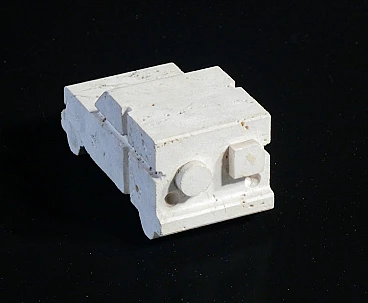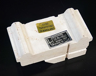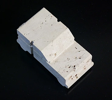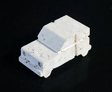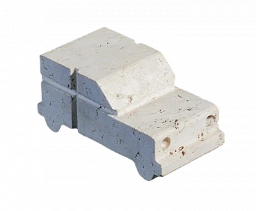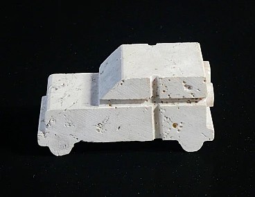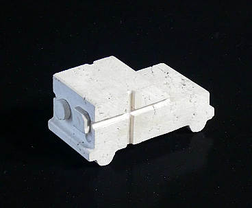 Scultura di macchinina in travertino di Rapolano di F.lli Mannelli, anni '70. I Fratelli Mannelli si sono distinti nel panorama dell'arte e del design italiano, specializzandosi nella creazione di sculture e oggetti d'arte in travertino, un materiale emblematico della Toscana. Attivi principalmente negli anni '60 e '70, il loro lavoro riflette l'estetica modernista italiana, caratterizzata da linee pulite e un approccio minimalista. Le loro sculture animali, tra cui pesci, elefanti e ricci, sono esempi emblematici di come abbiano saputo fondere la bellezza naturale del travertino con un design innovativo. Collaborando anche con rinomati artisti e designer, come Enzo Mari, hanno ampliato il loro repertorio a mobili e complementi d'arredo, mantenendo sempre un alto standard di qualità artigianale. Il contributo dei Fratelli Mannelli al design e all'arte non è solo un'eredità italiana ma è riconosciuto e celebrato a livello internazionale, testimoniando il loro impatto duraturo sul design modernista.