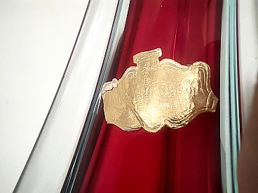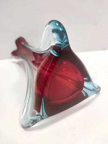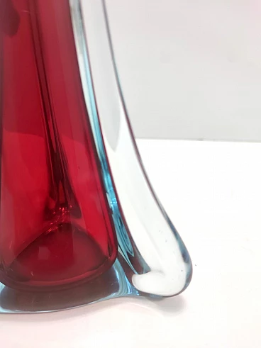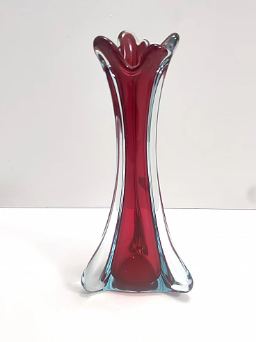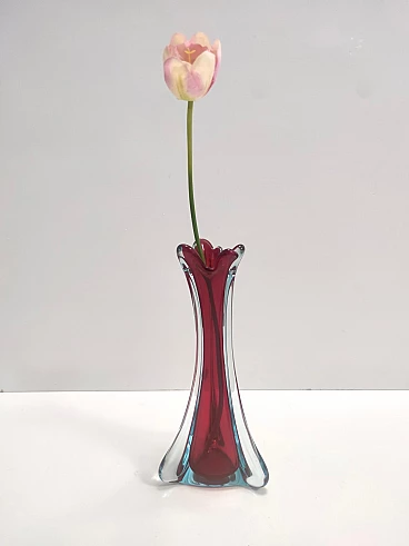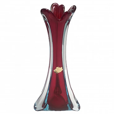Made in Italy, anni '60. Questo vaso è realizzato in vetro di Murano sommerso, soffiato a mano in tre diversi colori: trasparente, rosso cremisi e azzurro. Ha la sua etichetta originale. Si tratta di un oggetto vintage, quindi potrebbe presentare lievi tracce d'uso, ma può essere considerato in perfette condizioni originali e pronto a diventare un pezzo di casa.