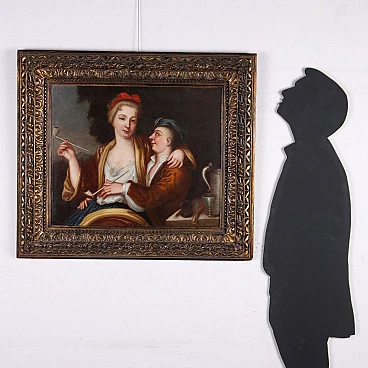 La scena allegorica presenta una donna discinta seduta sulle ginocchia di un uomo, presso un tavolo apparecchiato con una brocca, un calice, una tabacchiera ed un sigaro acceso.