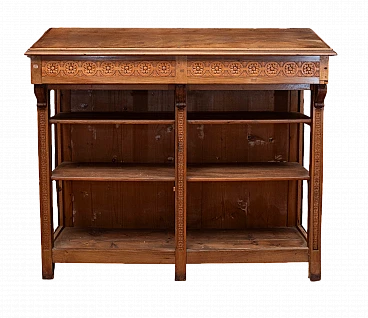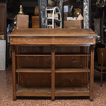 Libreria/credenza Liberty con sportello superiore che funge da leggio; questo è apribile a ribalta e ha un vano all'interno. È realizzata in noce con parti in massello intagliate con motivi floreali e parti impiallacciate. Il mobile era utilizzato come espositore e faceva parte dell'arredo di un piccolo bar negli anni del 1910-20. Il piano era inclinato per offrire ai clienti una superficie di appoggio per sfogliare il giornale. La struttura del mobile è robusta ma presenta alcune parti mancanti come da foto; non essendo mai stato restaurato necessita di interventi ma nel complesso può essere utilizzato anche come si trova attualmente.
