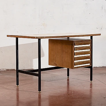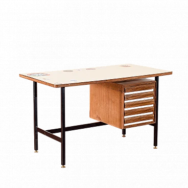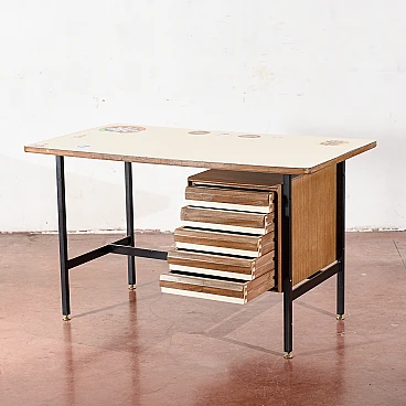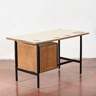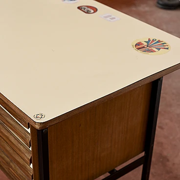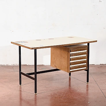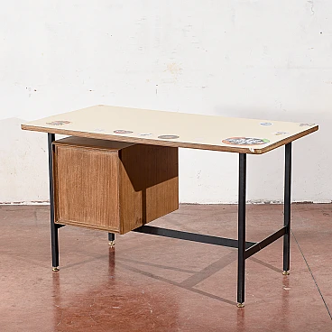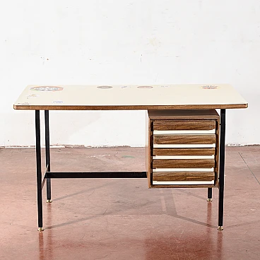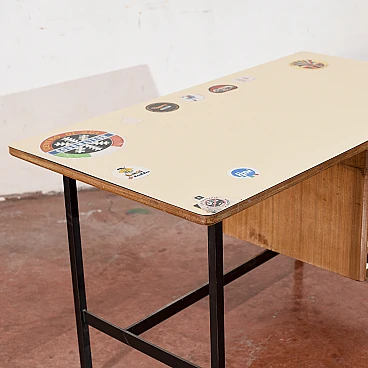 Scrivania degli anni '70 in compensato con piedi regolabili in ottone e struttura minimal in metallo. Piano con adesivi dell'epoca e non.