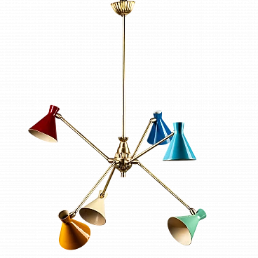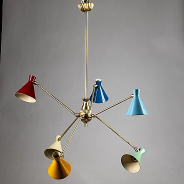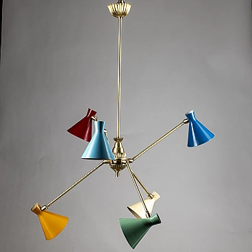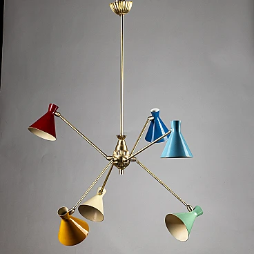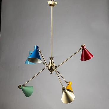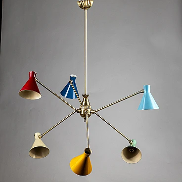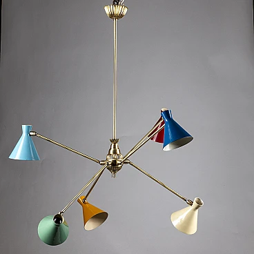 Lampadario di Stilnovo, anni '50. Struttura con snodi in ottone e diffusori in latta colorata.