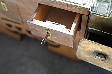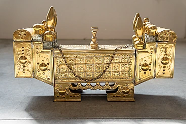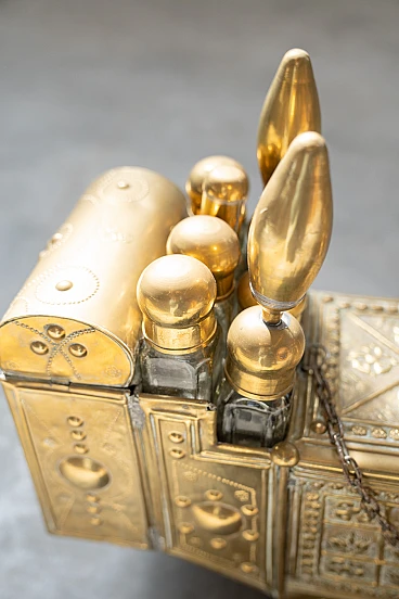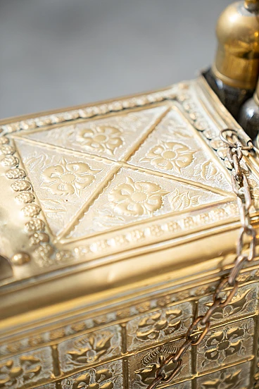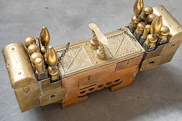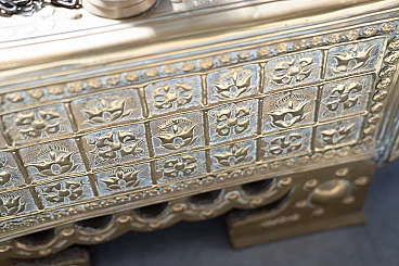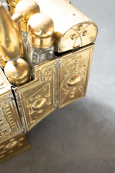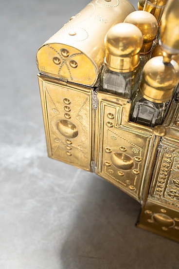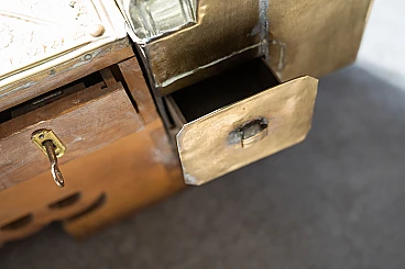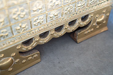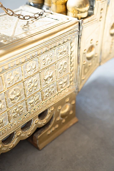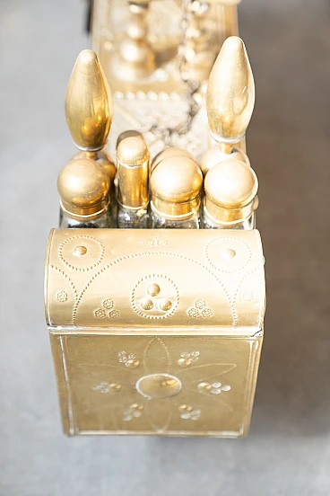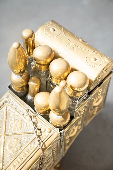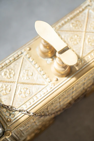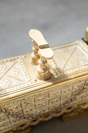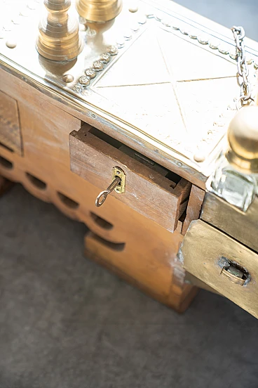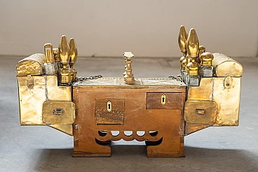 Lucidascarpe turco, in ottone, anni '70. Antica scatola da lustrascarpe tradizionale, realizzata a mano, in legno naturale e ottone con particolare attenzione e cura dei dettagli. Anch'essa con decorazioni fatte a mano, è particolarmente adatta a qualsiasi ambiente. Si tratta di un kit professionale, per donne e uomini che apprezzano l'antico stile di cura delle scarpe. Misure: H54 x L86 x P19 - Kg20. Periodo di progettazione: 1970. Anno di produzione: 1970. Paese di produzione: Türkiye. Colore: oro, marrone. Materiali: ottone, legno, ferro. Condizioni: Molto buone. LA SPEDIZIONE NON È GRATUITA, CHIEDETE UN PREVENTIVO PRIMA DI ACQUISTARE. VI DAREMO IL PREZZO ESATTO IN BASE ALLA VOSTRA POSIZIONE, PER ESSERE IN GRADO DI FORNIRE UN SERVIZIO ECCELLENTE.