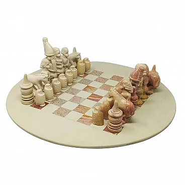 Stupefacente scacchiera italiana in travertino fatta a mano, tutti i pezzi sono sculture, qualche segno di invecchiamento su di essa, ma comunque gli oggetti sono in buone condizioni. 1960s