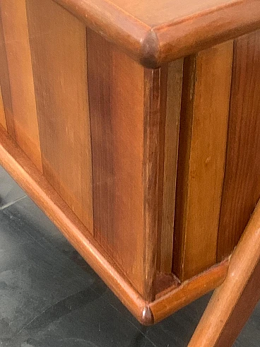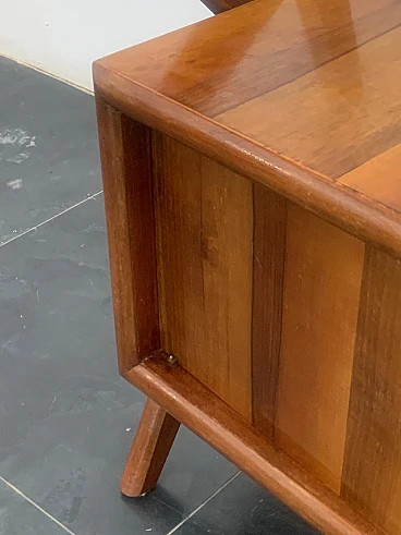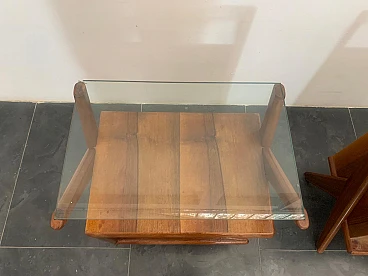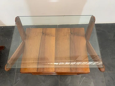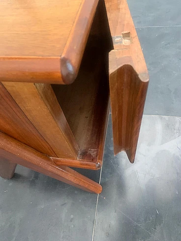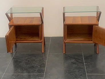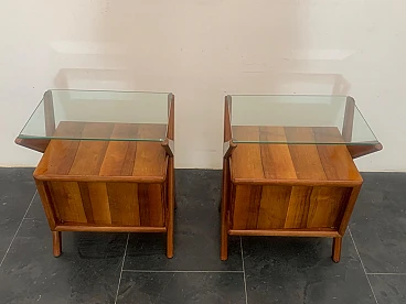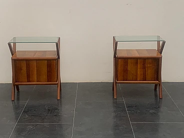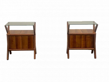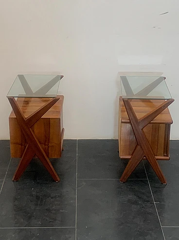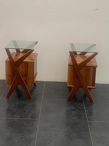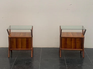 Coppia di comodini in palissandro e vetro, anni '60. Ottima qualità dei materiali e della costruzione, generosi gli spessori, bella la selezione del palissandro. I fianchi hanno delle lesene diagonali che si intrecciano, reggendo il corpo e il piano in vetro. Al centro lo sportello si presenta in diagonale evitando l'uso della maniglia e creando una geniale apertura. Il costruttore ha ripreso lo stile di Ico Parisi. Leggera usura dovuta all'età e all'utilizzo. Ottima funzionalità e pronti per l'utilizzo, micro rottura in un angolo del vetro (vedi foto).