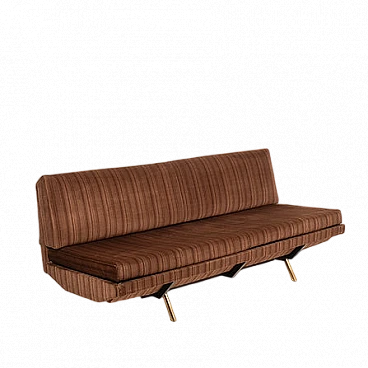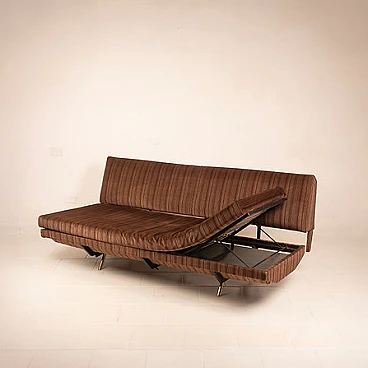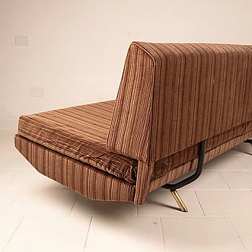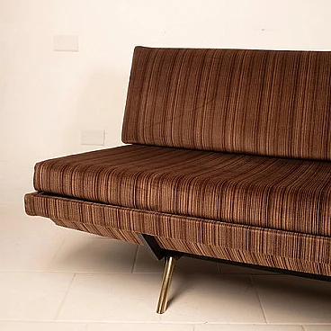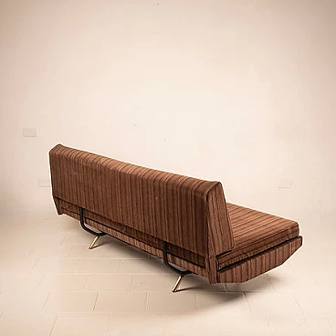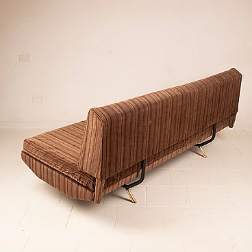 Divano Sleep O Matic di Marco Zanuso per Pizzetti, anni '50. Si presenta con il tessuto originale in ottime condizioni, un velluto cangiante rigato a effetto occhio di tigre, con i caratteristici piedi in ottone tipici del designer nei primi anni '50. È estremamente elaborato in quanto ha un meccanismo che permette di trasformarlo in chaise longue, come da foto, inoltre presenta un comodo vano sotto la seduta dove poter stipare oggetti per il salotto. Presente il marchio di produzione nel vano interno e sulle cinghie. Ottime condizioni generali, segnaliamo solo tre minuscoli fori di sigaretta di 2 mm sulla seduta, i quali non compromettono l'estetica perchè minimali e poco visibili.