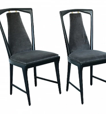 4 Sedie Design Osvaldo Borsani per Atelier Borsani Varedo anni '40. Completamente restaurate, struttura in legno di mogano ri-laccata con vernice nera, ottone lucidato e nuovo rivestimento in velluto grigio.