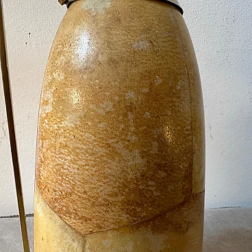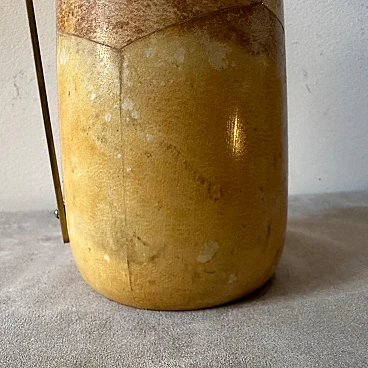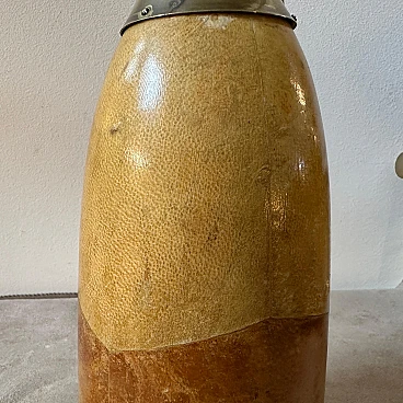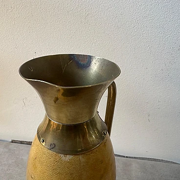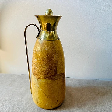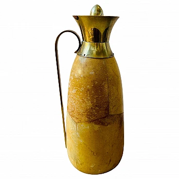 Una caraffa thermos disegnata da Aldo Tura, prodotta a Milano negli anni Cinquanta da Macabo, in condizioni vintage con segni d'uso e d'età visibili nelle foto. Questa caraffa presenta le caratteristiche distintive del design associato all'era moderna di metà secolo e allo stile unico di Aldo Tura. La caraffa presenta una combinazione di pelle di capra ambrata dipinta a mano e ottone. Aldo Tura era noto per l'uso di materiali insoliti e lussuosi e la pelle di capra era un elemento caratteristico di molti dei suoi modelli. La caraffa incarna le linee eleganti e pulite caratteristiche del design moderno di metà secolo. Ha una forma snella ed elegante, che riflette la semplicità e la funzionalità enfatizzate in questo periodo. Il colore dominante è l'ambra, che riflette il tono naturale della pelle di capra, mentre gli accenti in ottone aggiungono calore e raffinatezza all'aspetto generale. Gli am designs di Aldo Tura sono caratterizzati da una combinazione di artigianato tradizionale ed estetica moderna. Il suo lavoro era noto per l'attenzione ai dettagli, l'uso di materiali lussuosi e una certa giocosità o bizzarria nel design.