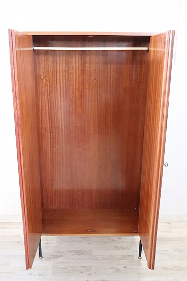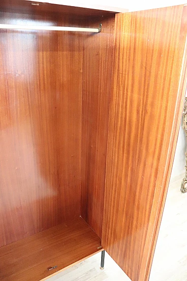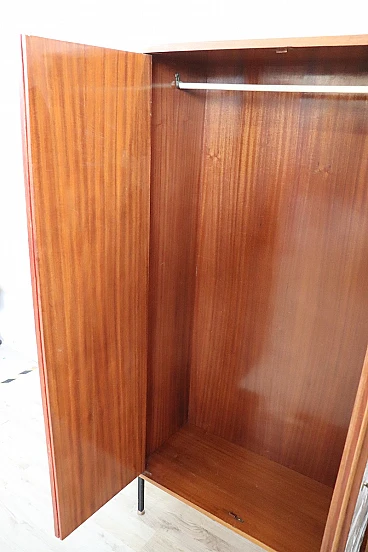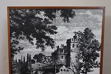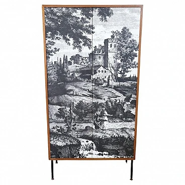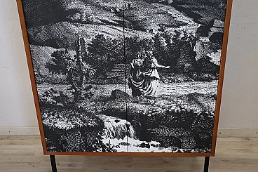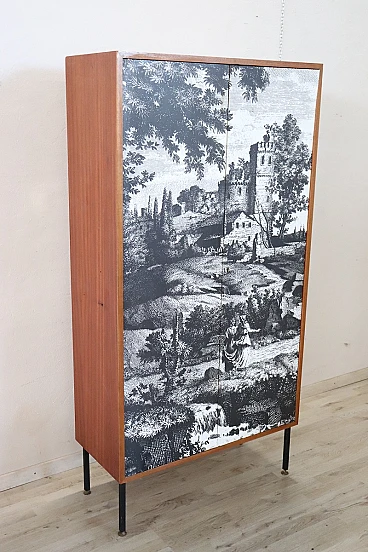Particolare armadio a due ante vintage italiano degli anni '70. Realizzato in legno di multistrato, è caratterizzato da una grande decorazione a stampa sulle ante frontali. Un'immagine di gusto