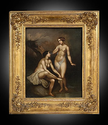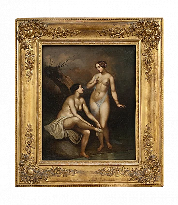 Dipinto a olio su tela Napoleone III raffigurante delle ninfe al bagno, realizzato in Francia nella seconda metà dell'800. La composizione della scena è impegnata dalle due donne seminude ritratte in aperta campagna. I due personaggi sono ben modellati, la pennellata è corposa e l'uso del chiaroscuro crea volume e plasticità. La luce illumina la figure creando zone di chiaroscuro con la vegetazione circostante. La tela è impreziosita da una bella cornice francese in legno dorato in foglia oro coeva al dipinto. Completo di certificato di autenticità. Siamo a vostra disposizione per ulteriori chiarimenti o particolari fotografici. Spedizione in tutta Italia, Europa e Resto del Mondo in massima sicurezza e tracciabile. La spedizione sarà concordata privatamente.