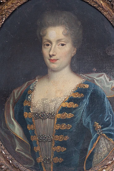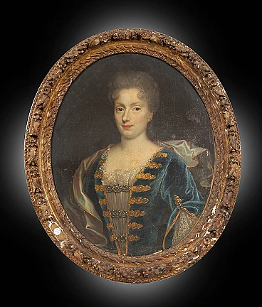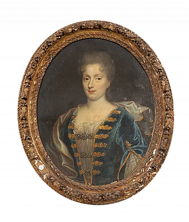 Dipinto a olio su tela francese raffigurante il ritratto di Maria Giovanna Battista di Savoia-Nemours, '700. Cornice coeva in legno dorato. La nobildonna di alta estrazione sociale è ritratta a mezzo busto, indossa una veste morbida in tessuto operato di colore grigio e blu, con pizzi che percorrono la scollatura; fermagli in argento e rubini drappeggiano il tessuto sul petto e sulle maniche. Si notino la resa attenta dei tratti del viso, l'attenzione alle sfumature dell'incarnato, la nitidezza dei contorni sottolineati dalla luce. Cornice da restaurare. Opera completa di certificato di autenticità. Siamo a vostra disposizione per ulteriori chiarimenti o particolari fotografici. Spedizione in tutta Italia, Europa e Resto del Mondo in massima sicurezza e tracciabile. La spedizione sarà concordata privatamente.
