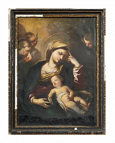Dipinto a olio su tela raffigurante la Madonna con il Bambino attribuito a Francesco Solimena, '700. In quest'opera Solimena esprime diversi elementi della sua poetica con una delicatezza pienamente Rococò. Il pittore campano, variando i toni del chiaroscuro dalla mantella ondulata al bambino, passa dalla diffusa ariosità del Rococò a un tenebrismo più tipico del Barocco napoletano. La tela qui offerta costituisce un ottimo esempio della produzione che Solimena, coadiuvato dalla bottega, seppe destinare alla devozione domestica di collezionisti privati desiderosi di possedere un saggio dell'attività del maggiore artista napoletano del suo tempo. Il forte risalto plastico delle figure sottolineato dal chiaroscuro ne suggerisce una datazione nei primi anni del '700. Cornice e tela da restaurare. Opera completa di certificato di autenticità. Siamo a vostra disposizione per ulteriori chiarimenti o particolari fotografici. Spedizione in tutta Italia, Europa e Resto del Mondo in massima sicurezza e tracciabile. La spedizione sarà concordata privatamente.